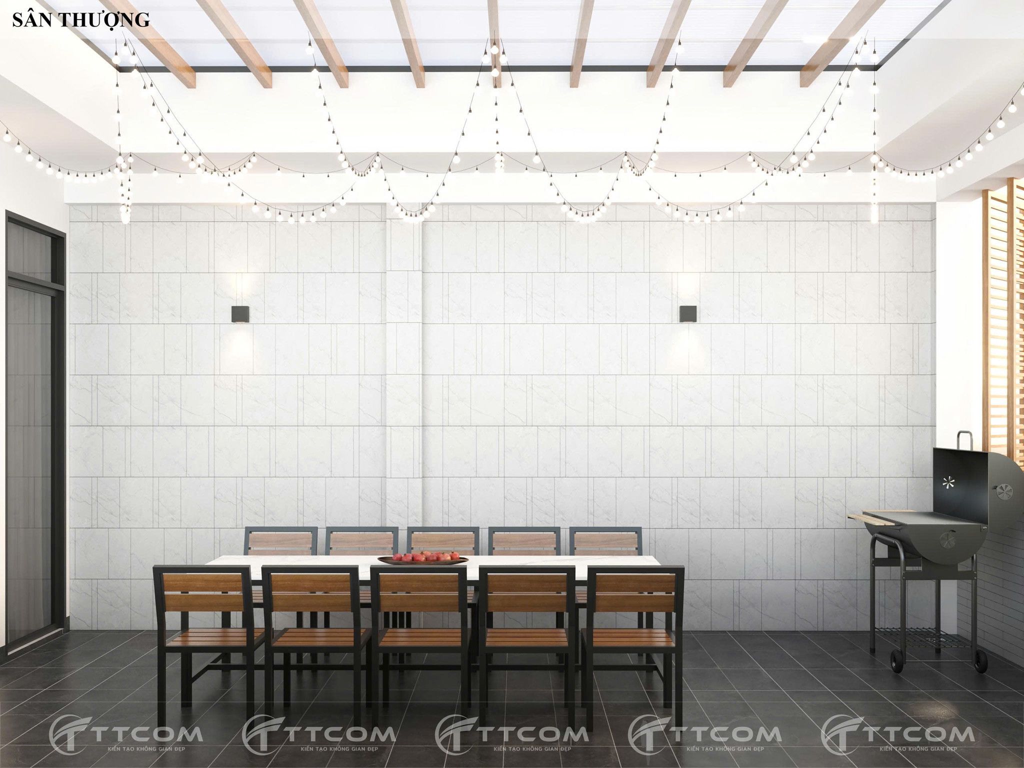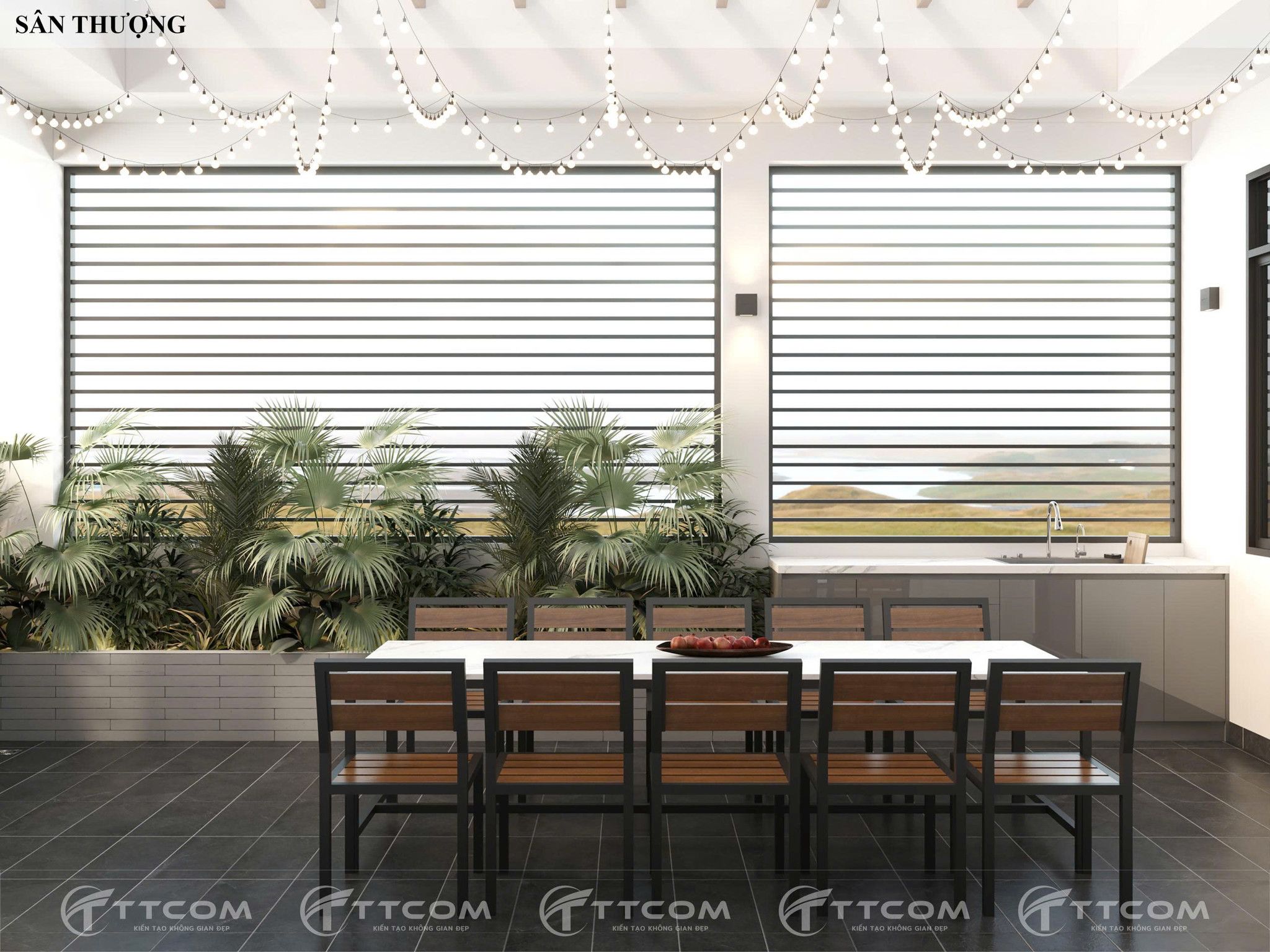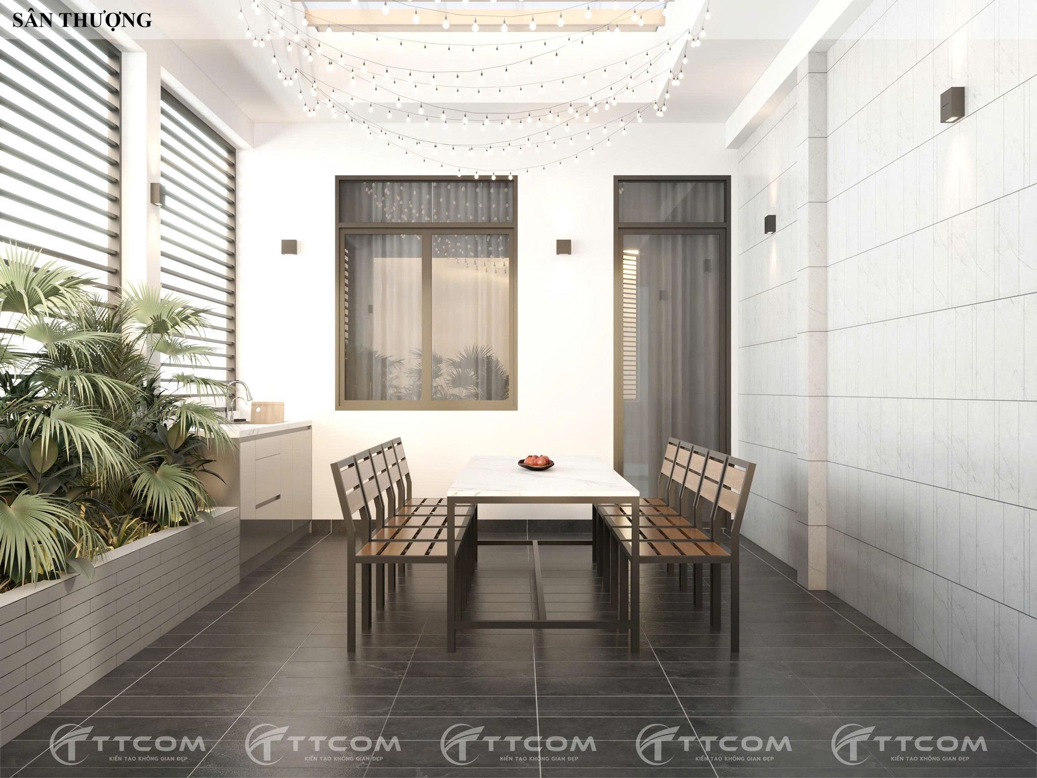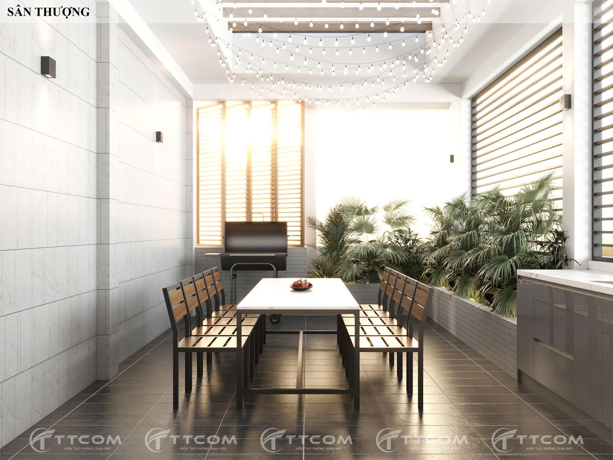 Cải tạo sân thượng thành nơi sum họp gia đình, kết hợp bàn ăn ngoài trời, cây xanh và hệ thống đèn trang trí, mang đến không gian nghỉ ngơi lý tưởng ngay trong nhà phố.