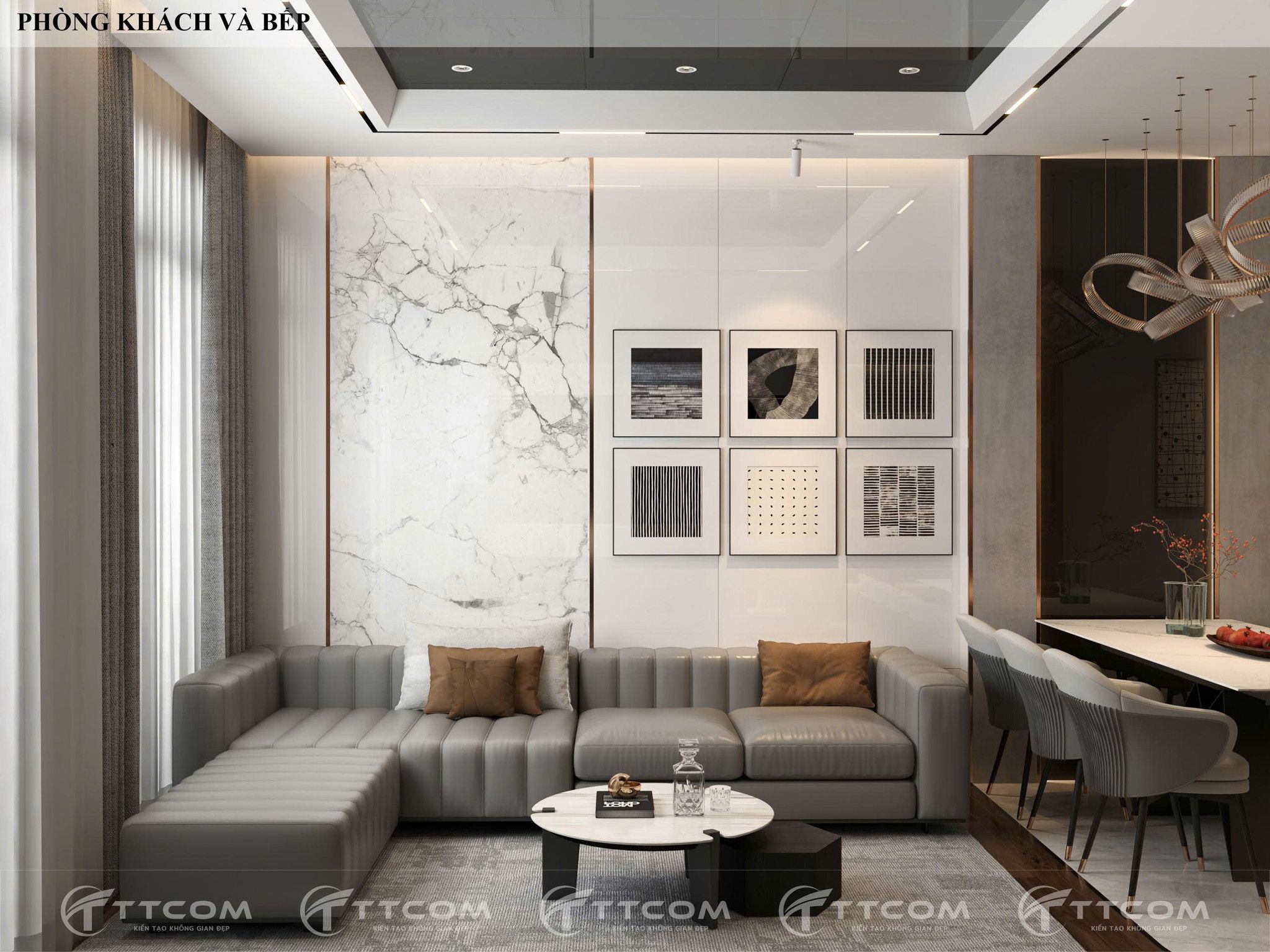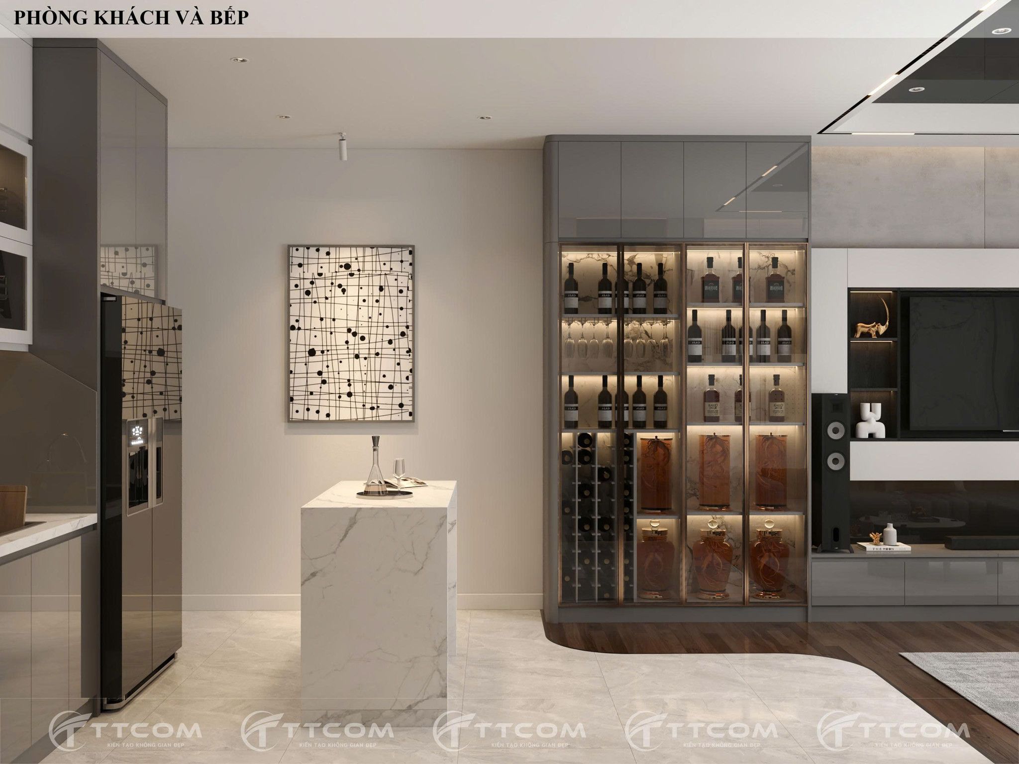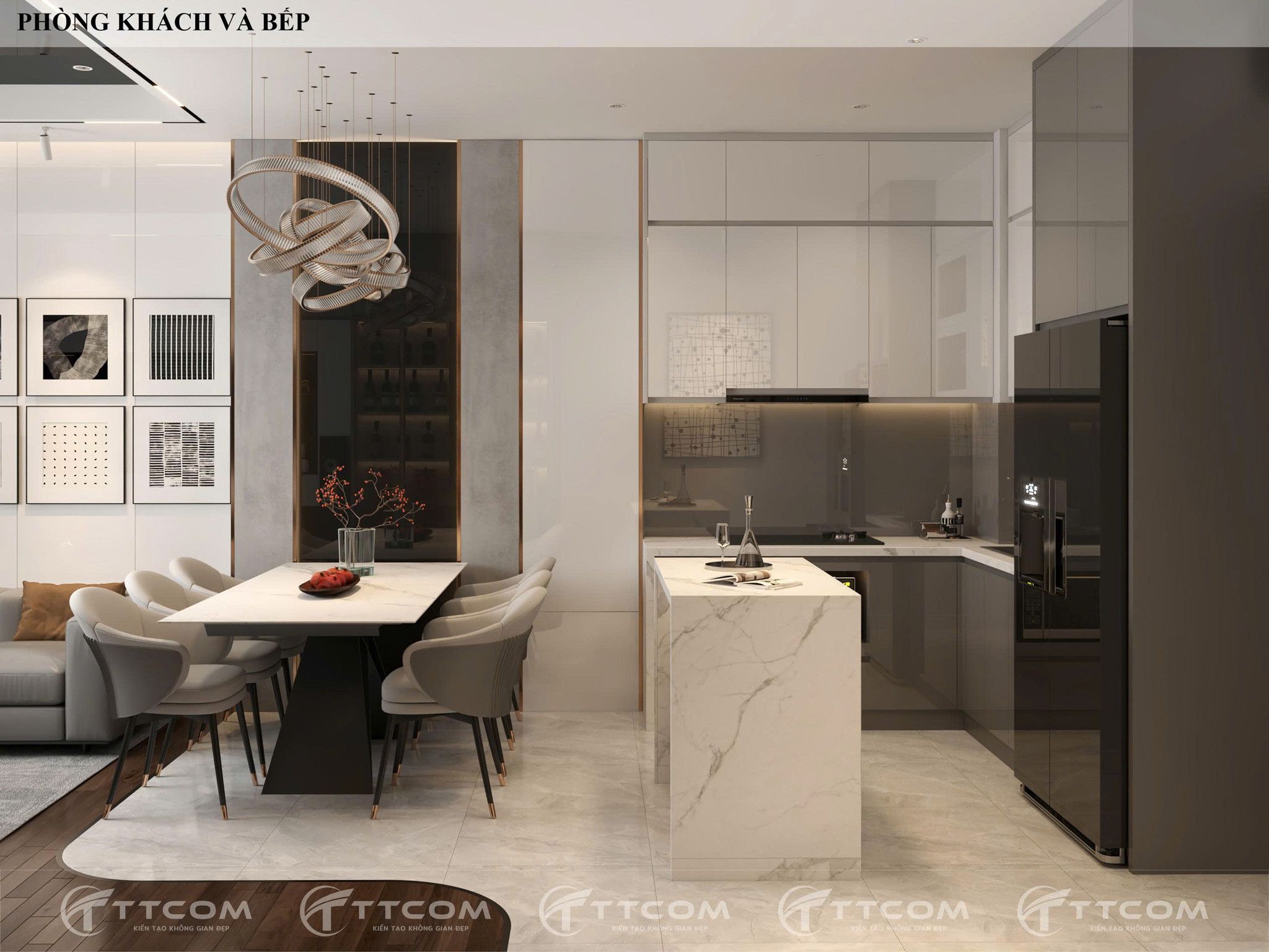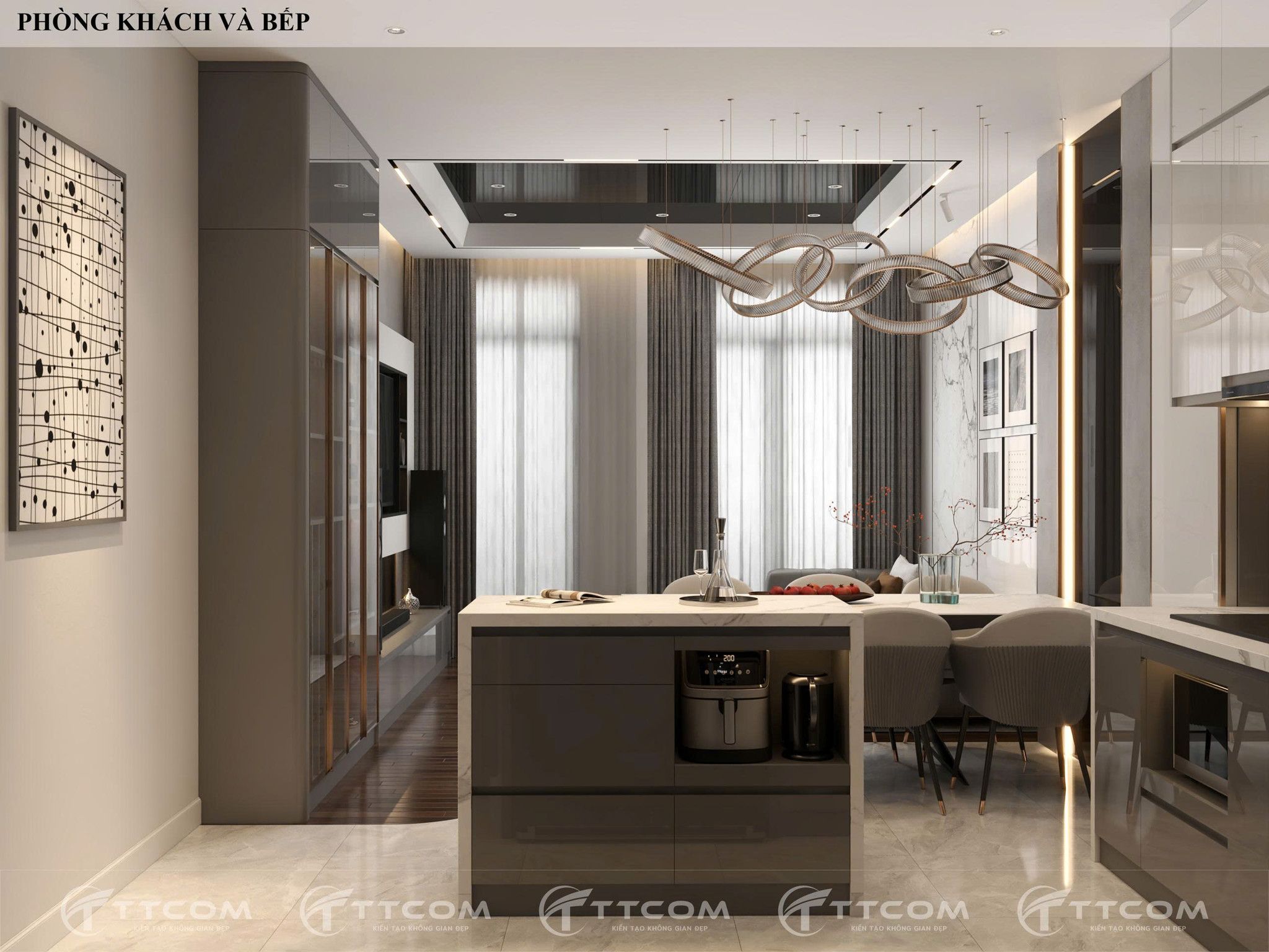 Việc kết hợp phòng khách và bếp liền kề tạo nên sự liên kết trong sinh hoạt, đồng thời tận dụng ánh sáng tự nhiên qua hệ cửa kính lớn. Thiết kế hiện đại với tone màu trung tính, bàn đảo bếp kết hợp bàn ăn vừa thẩm mỹ vừa tối ưu diện tích.