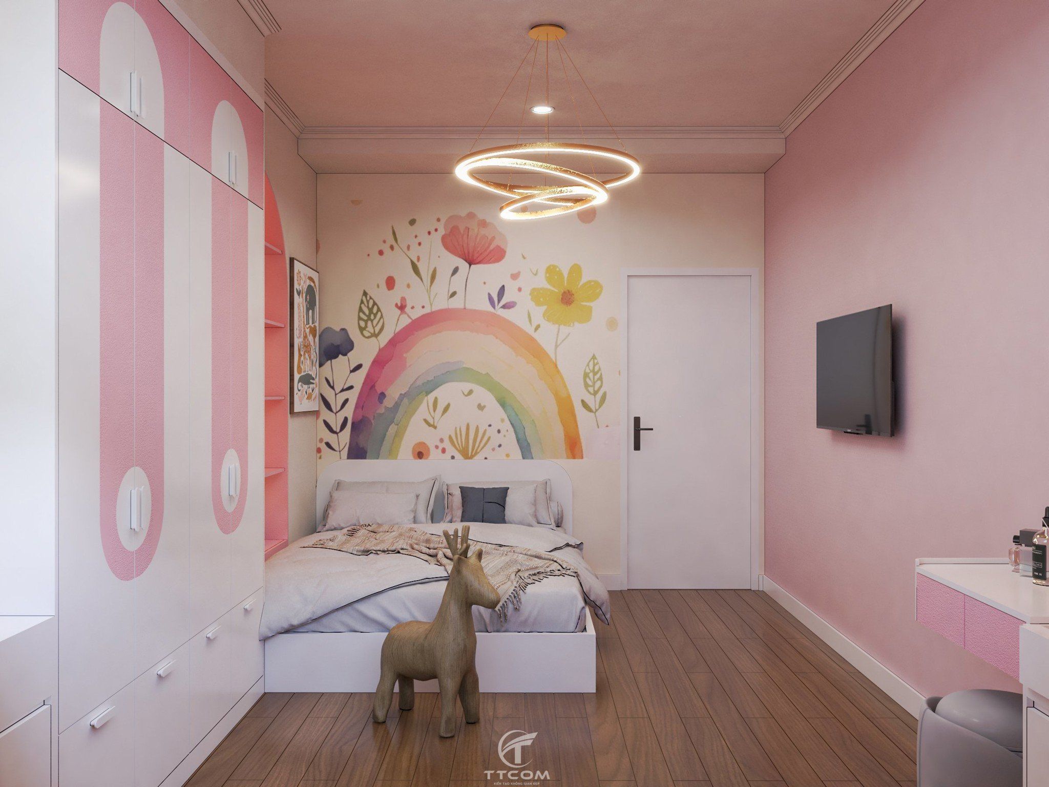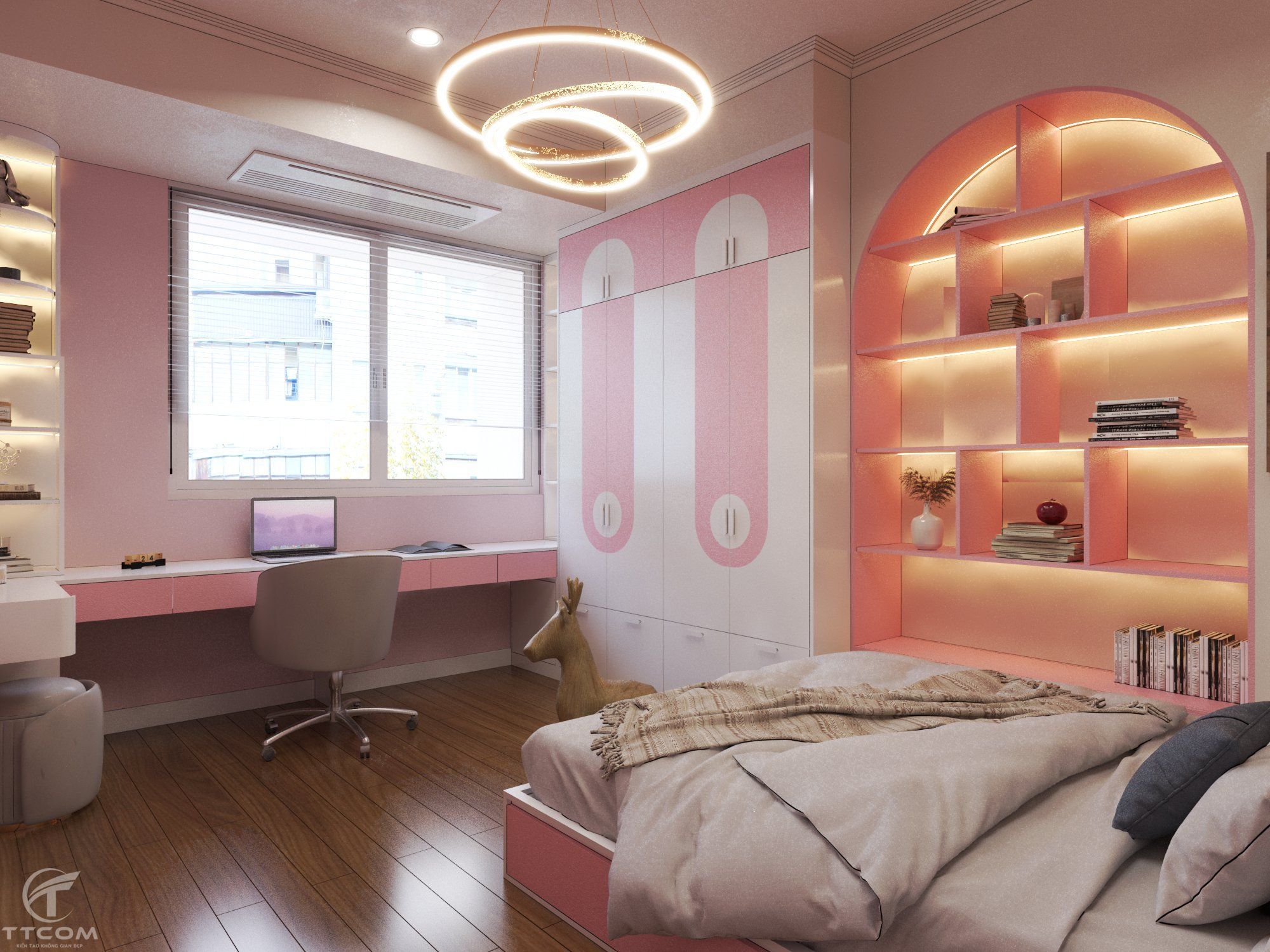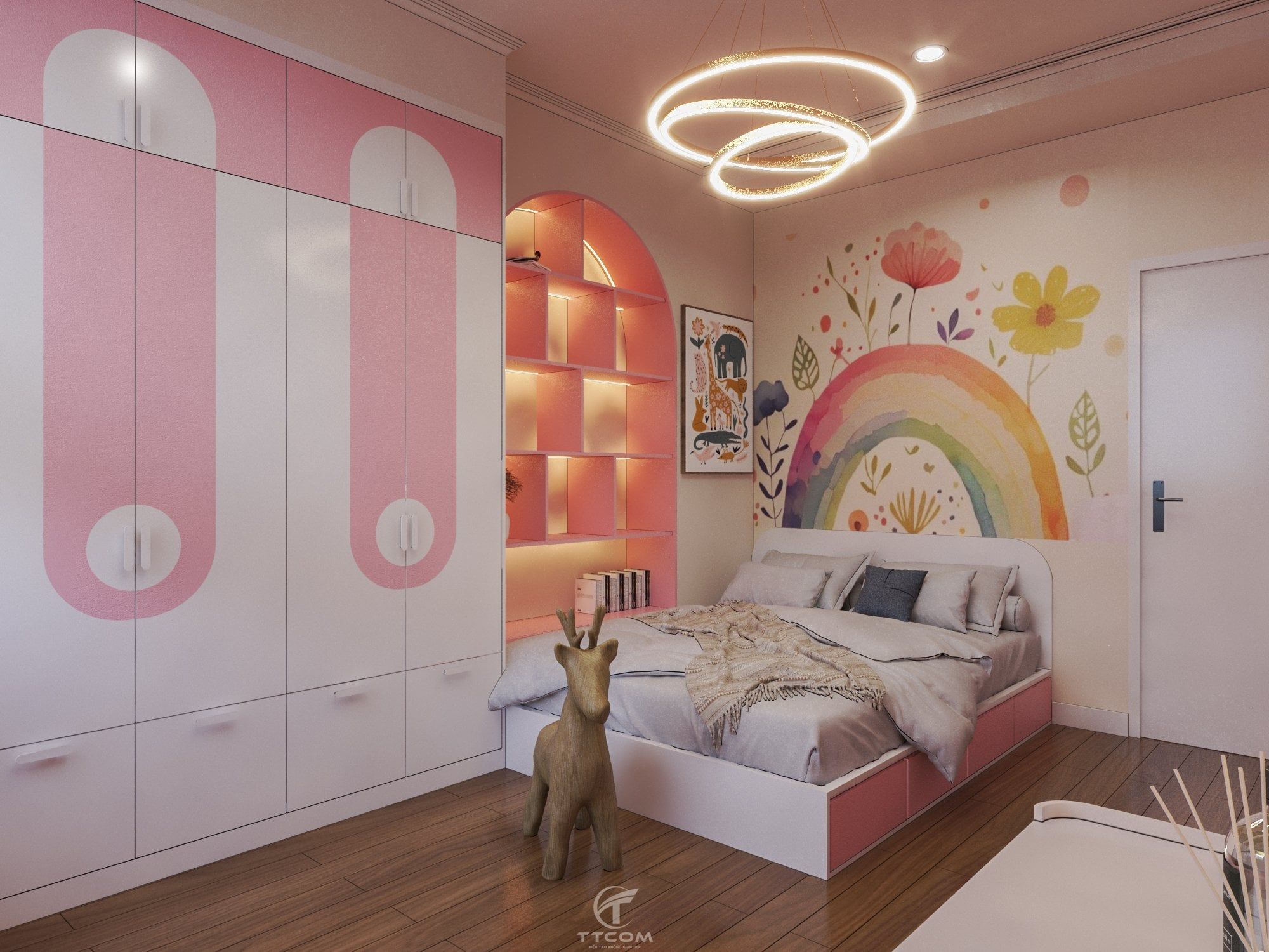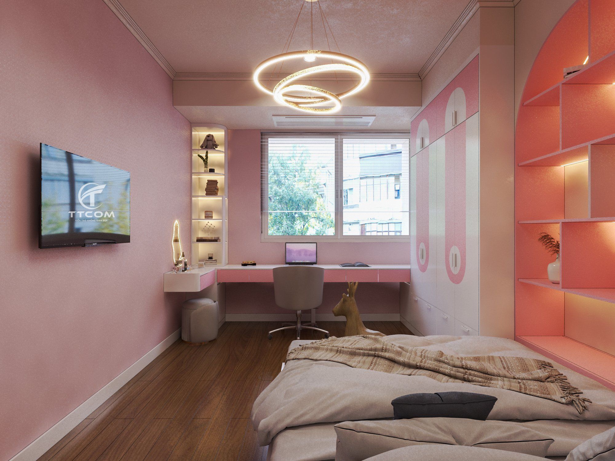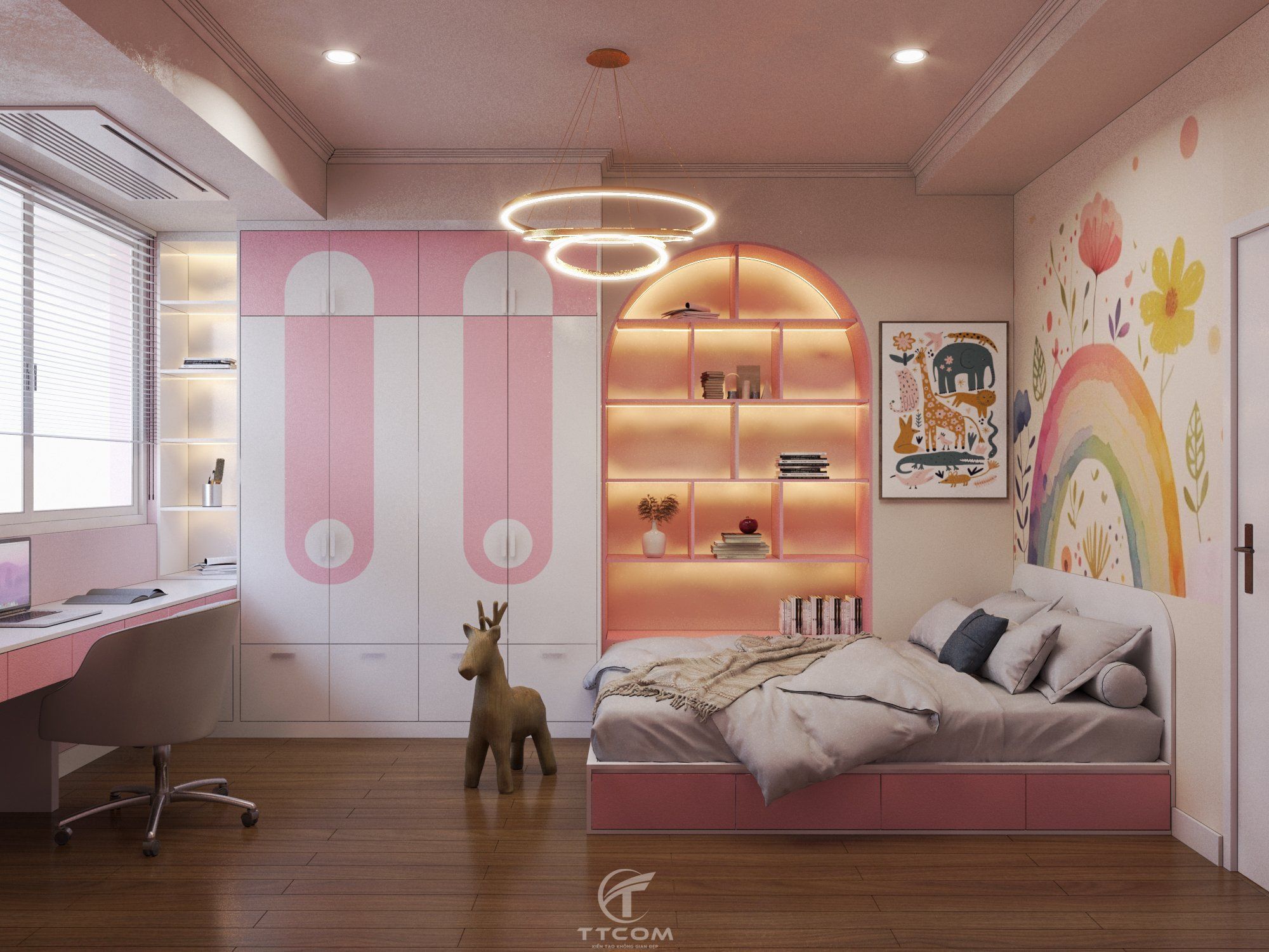 Không gian phòng ngủ bé sử dụng gam màu hồng pastel, tạo sự tươi vui và năng động.