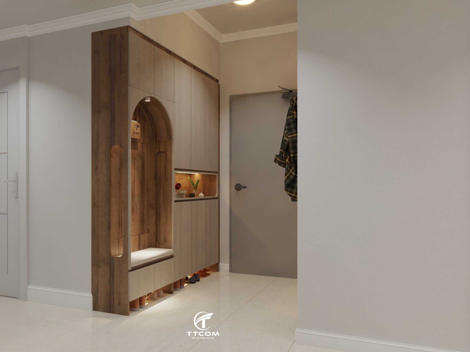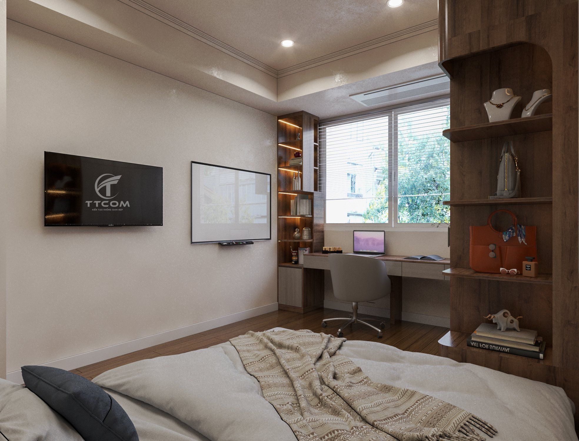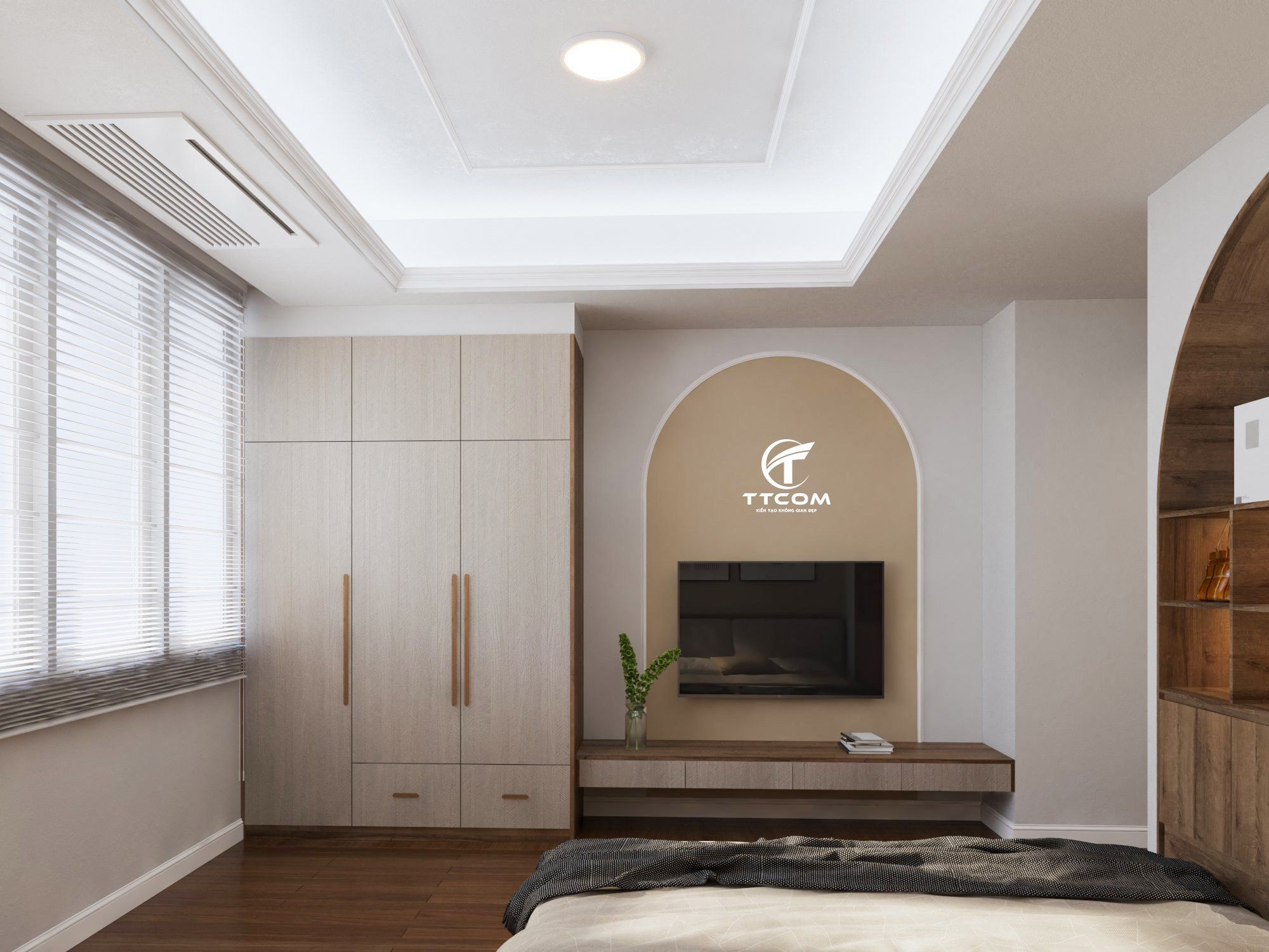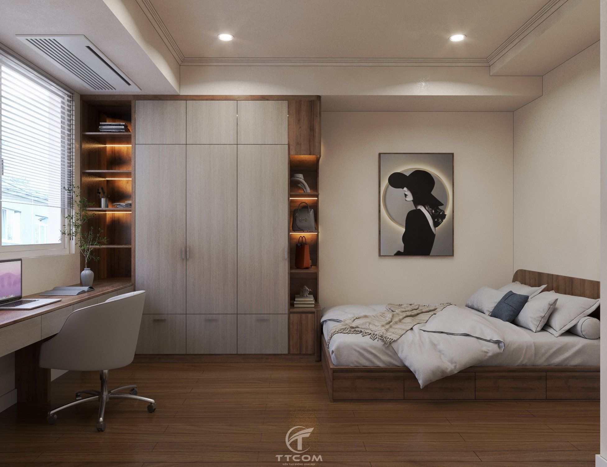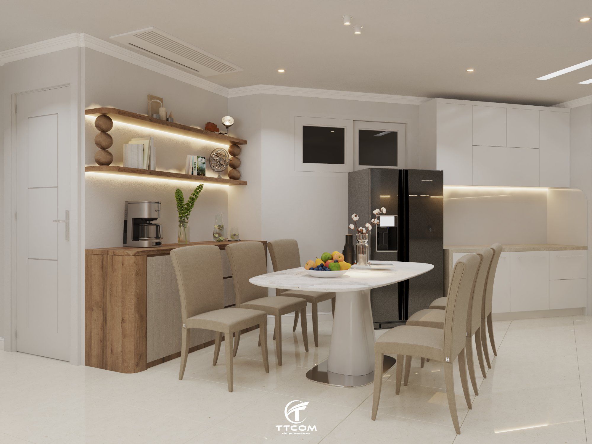 Gam màu chủ đạo: Trắng – be – nâu gỗ, tạo cảm giác ấm cúng nhưng vẫn sang trọng.