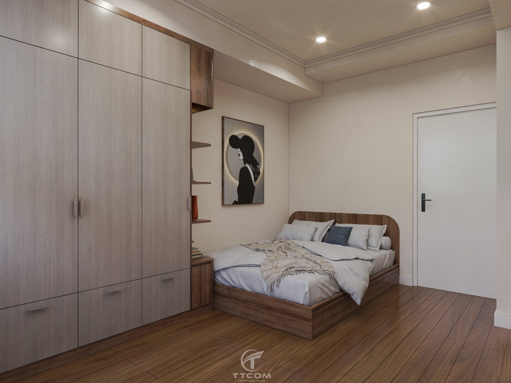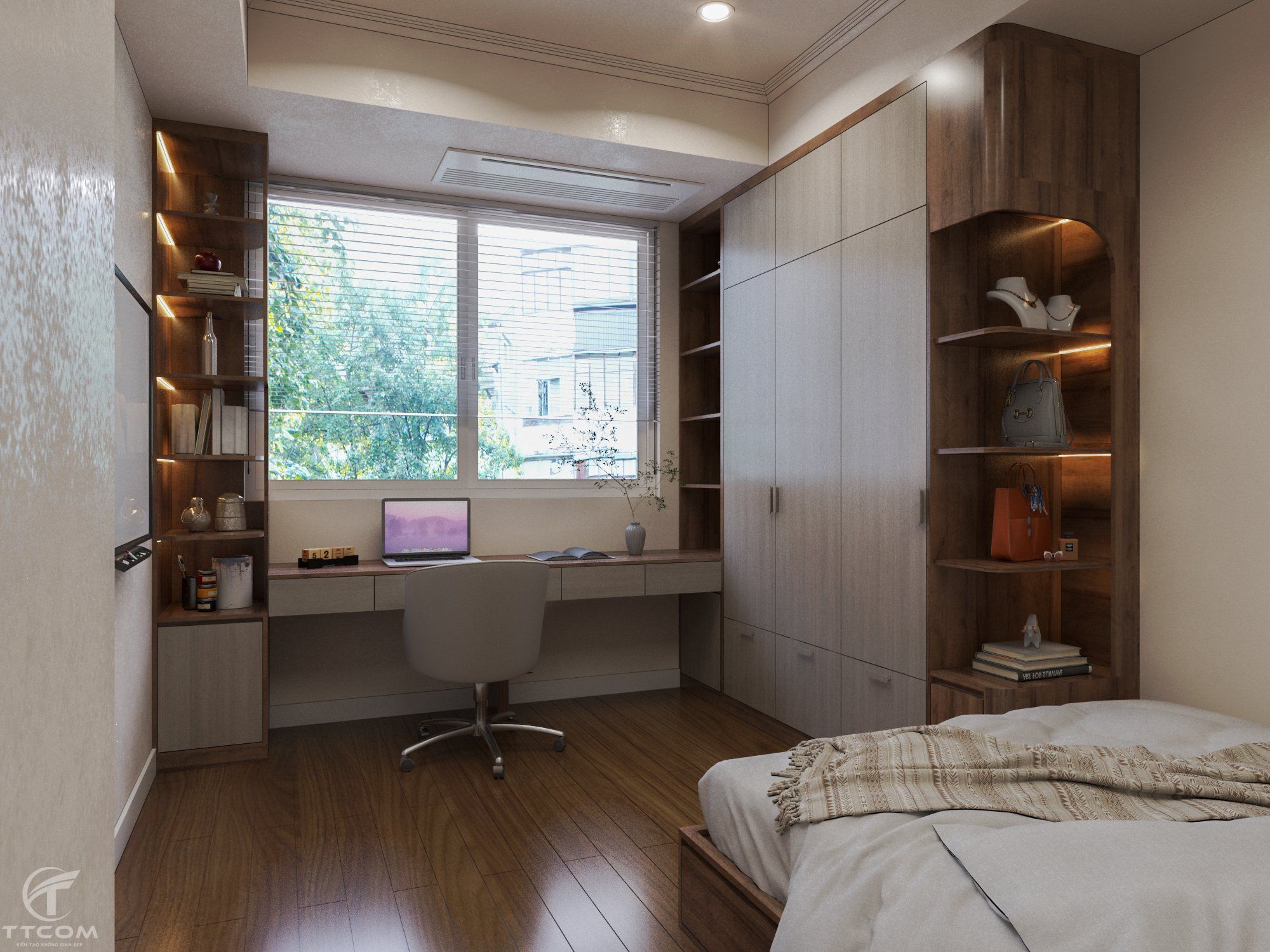 Phòng ngủ phụ tối giản hơn, dành cho khách hoặc người lớn tuổi.