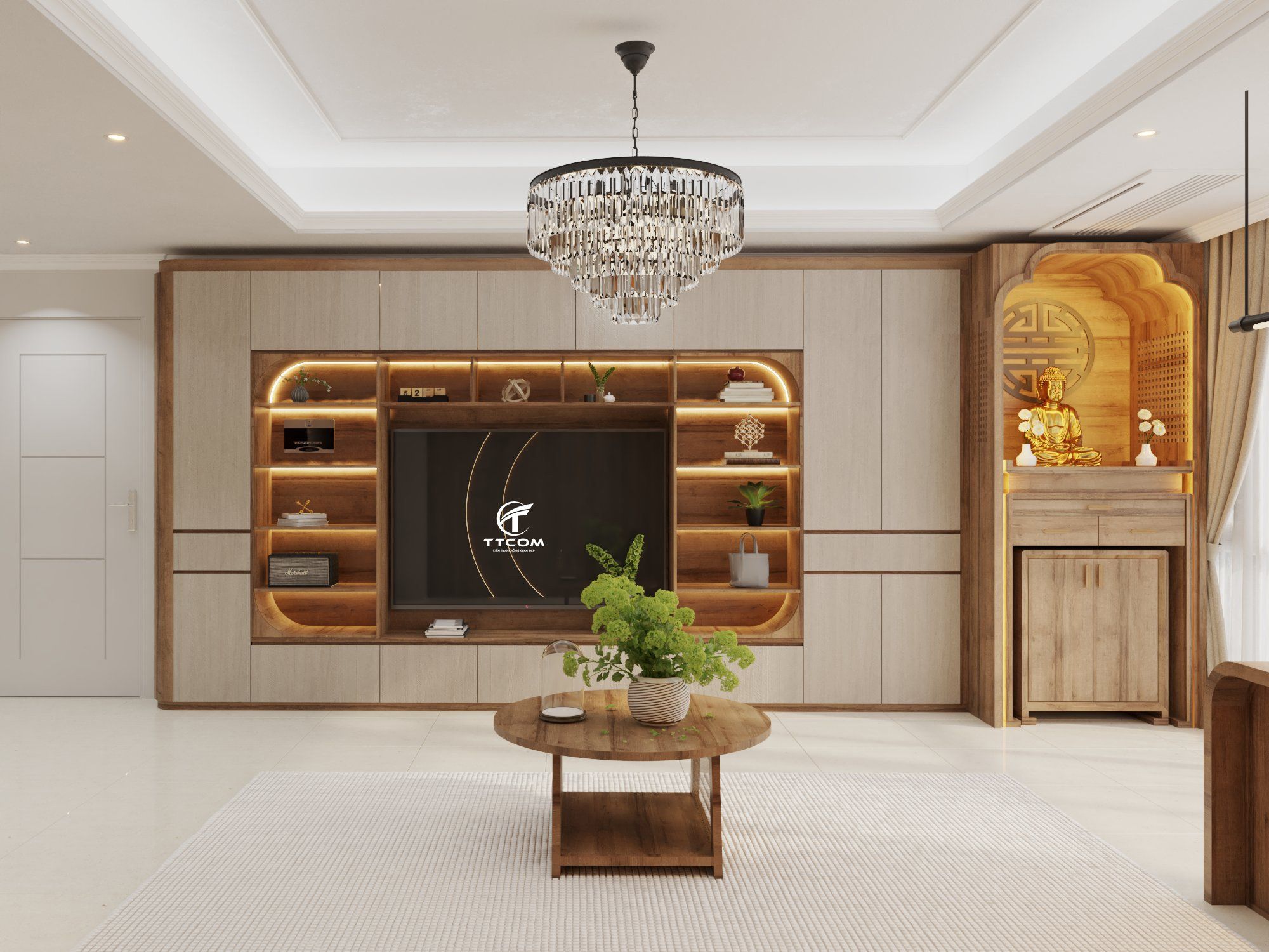 Phòng khách nổi bật với mảng tường gỗ kết hợp đèn led vòm nghệ thuật, mang lại cảm giác hiện đại và sang trọng. Bộ sofa màu be trung tính kết hợp bàn trà gỗ tự nhiên tạo nên tổng thể hài hòa.