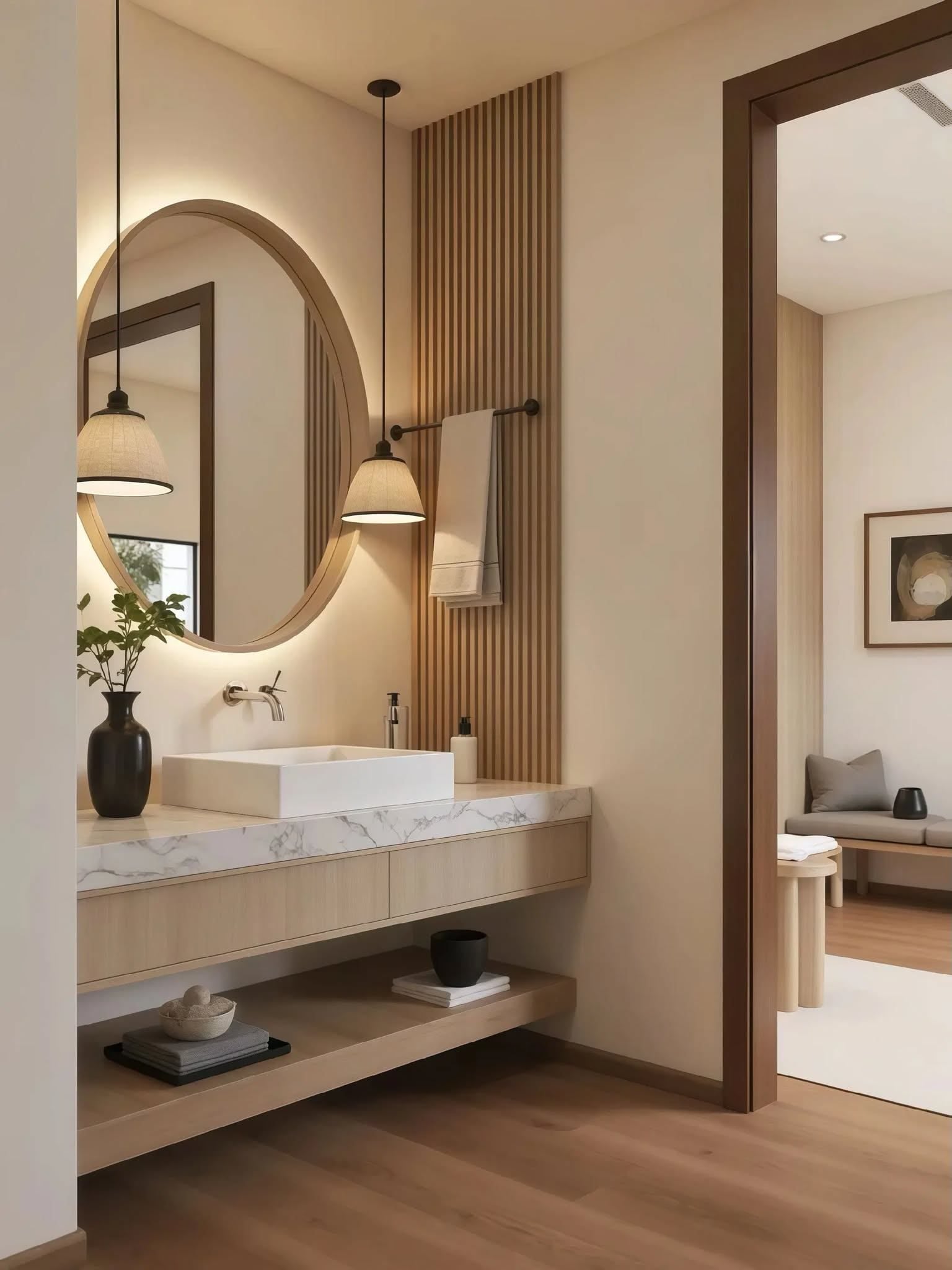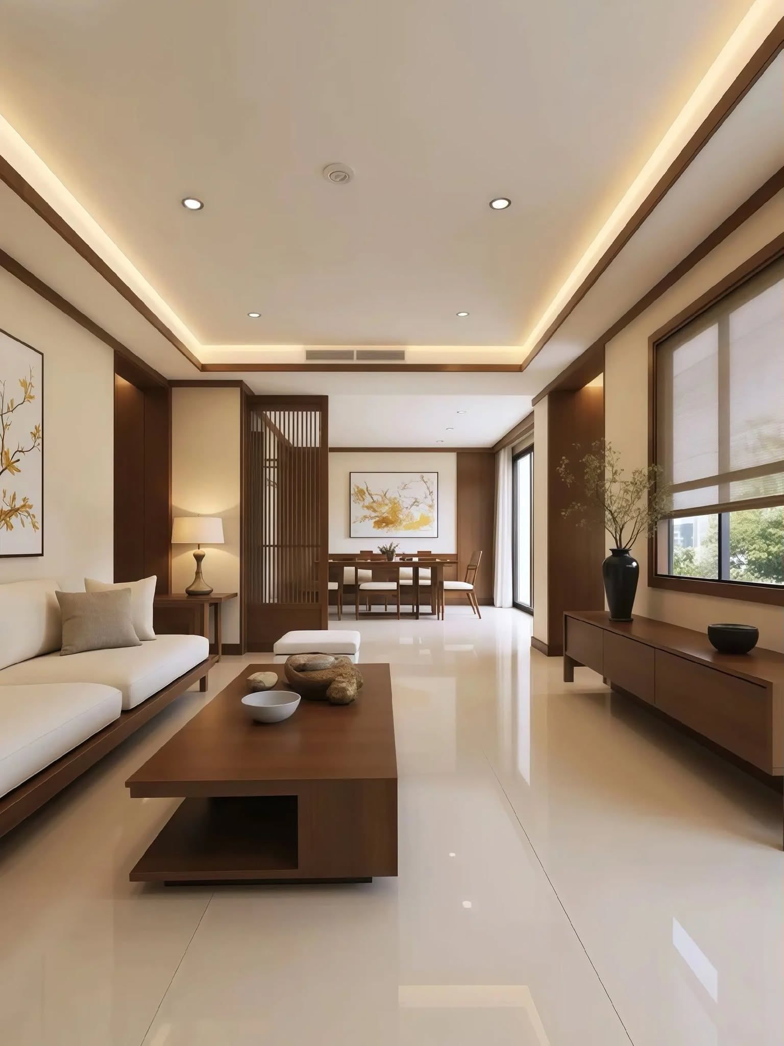 Bộ hình dưới đây là ví dụ hoàn hảo cho một thiết kế Á Đông hiện đại chuẩn mực: bố cục sạch sẽ, vật liệu tự nhiên, ánh sáng tinh tế và các chi tiết trang trí mang đậm dấu ấn văn hóa.