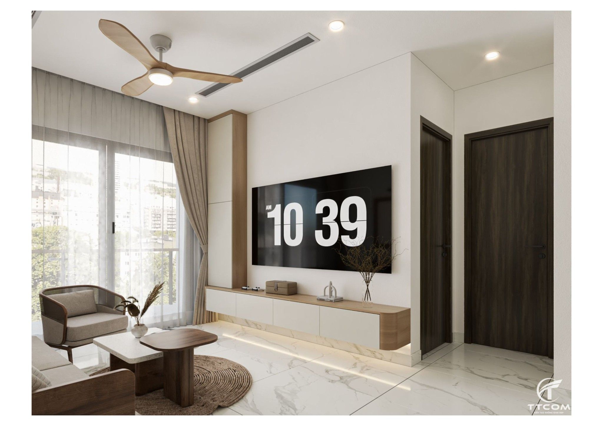 Phòng khách được thiết kế với gam màu be – nâu – xám chủ đạo, kết hợp cùng nội thất gỗ tự nhiên mang lại cảm giác ấm áp. Bộ sofa đơn giản, bàn trà gọn nhẹ đặt trên thảm tròn tạo điểm nhấn tinh tế.