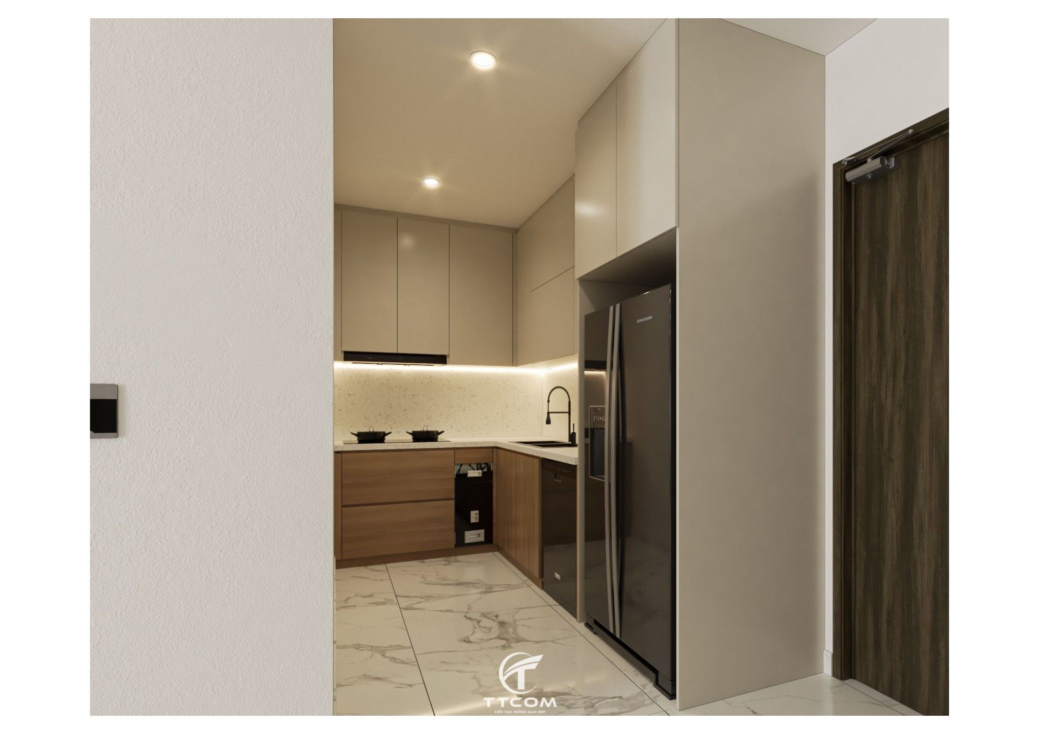 Khu bếp được bố trí khoa học theo dạng chữ L, vừa tiết kiệm diện tích vừa đảm bảo công năng. Tông màu gỗ sáng kết hợp cùng tủ bếp trên màu kem tạo sự hài hòa và hiện đại. Hệ thống đèn led âm trần dưới tủ bếp giúp không gian thêm sang trọng và tiện lợi khi nấu nướng.