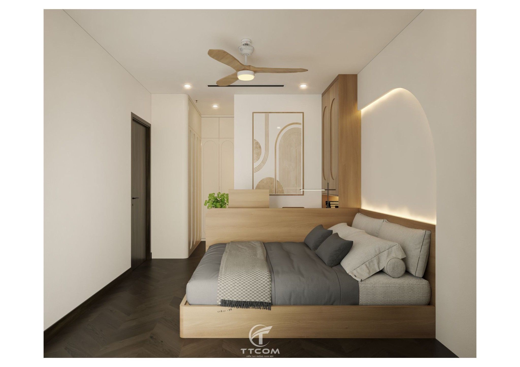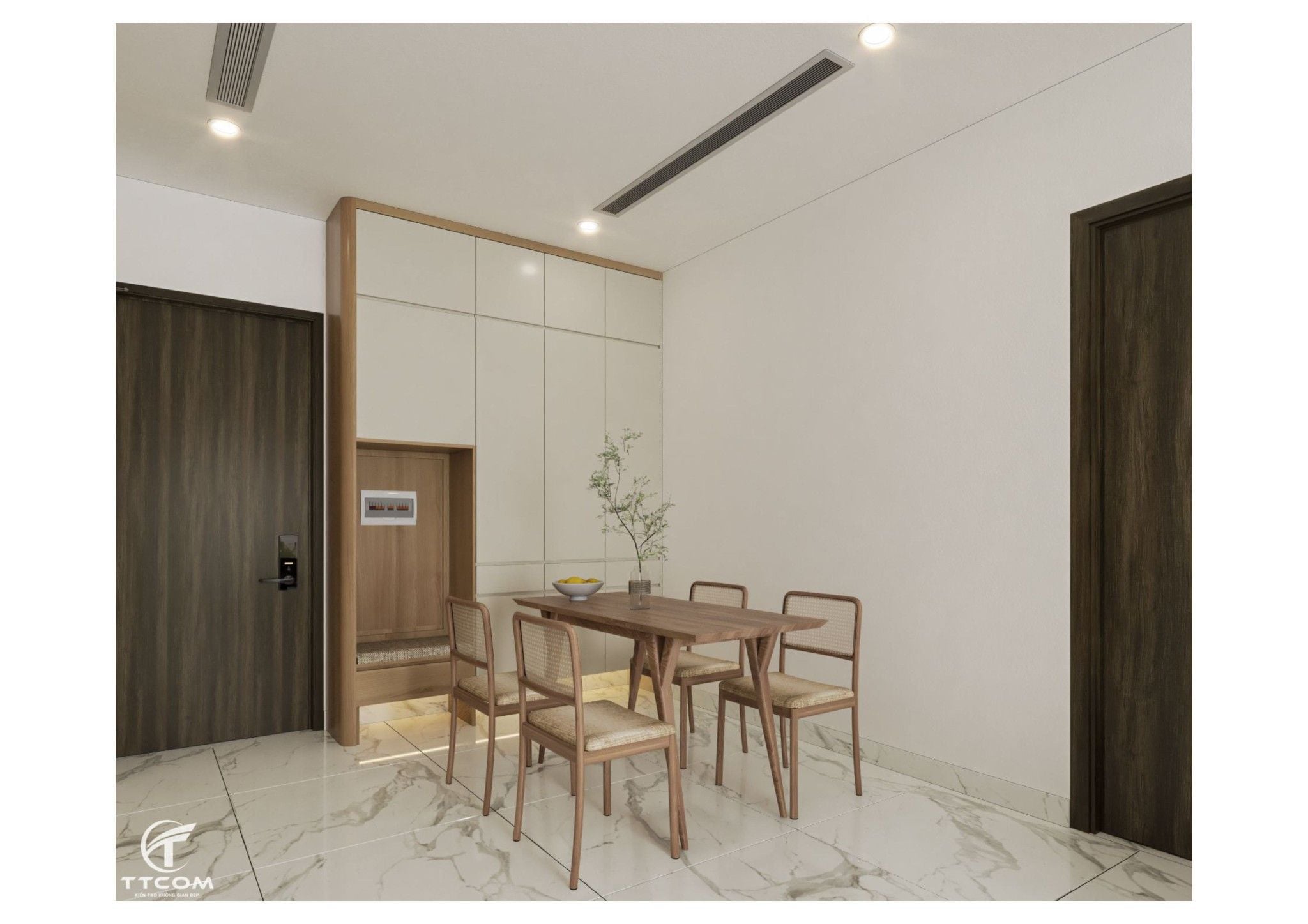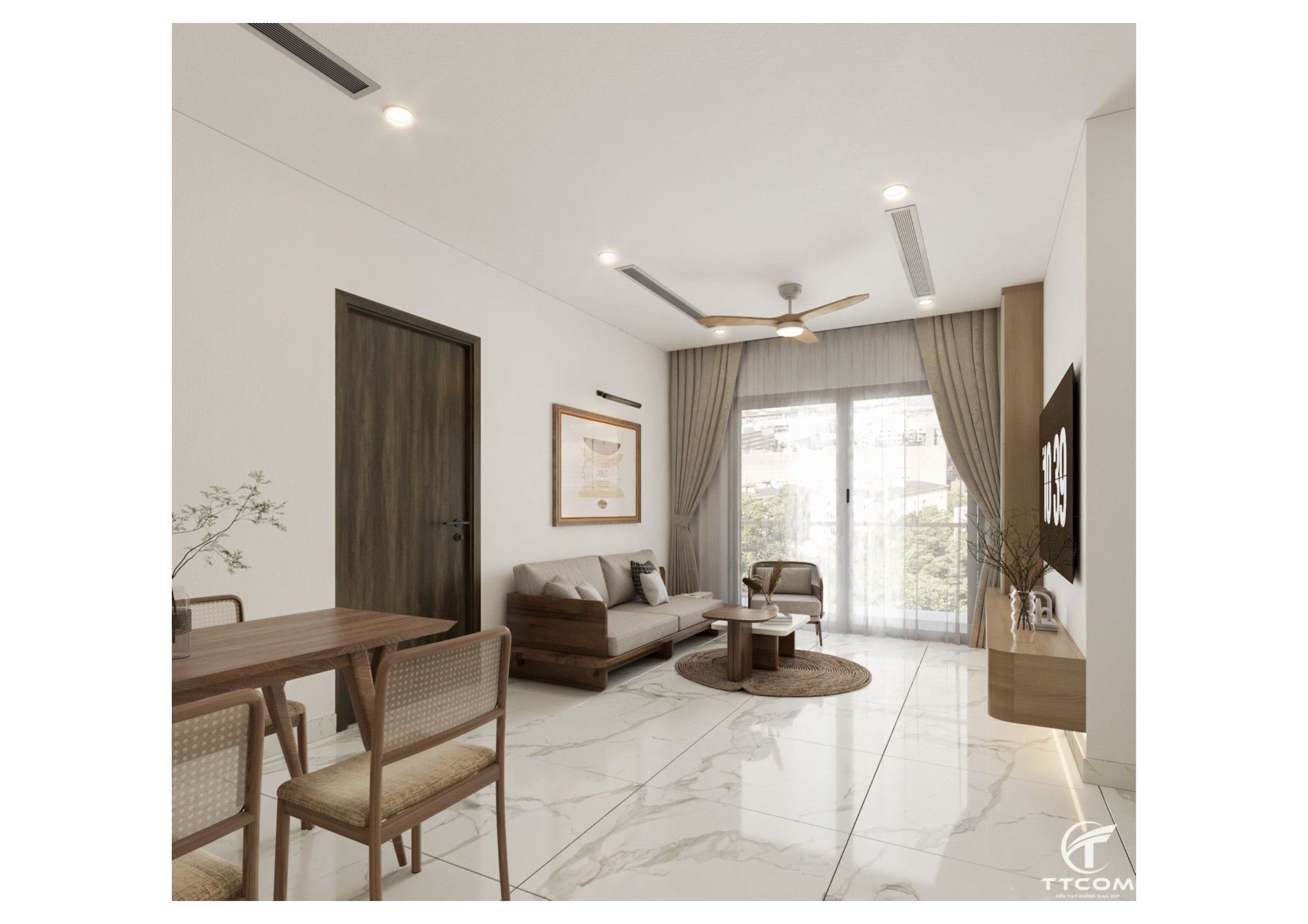 Nếu bạn đang tìm kiếm một không gian sống vừa ấm cúng, vừa hiện đại thì mẫu thiết kế căn hộ 2 phòng ngủ tại Quận 9 dưới đây chắc chắn sẽ khiến bạn hài lòng. Với sự kết hợp tinh tế giữa gam màu trung tính, nội thất gỗ sang trọng và phong cách thiết kế tối giản hiện đại, căn hộ mang đến một không gian sống tiện nghi, hài hòa và đầy tính thẩm mỹ.