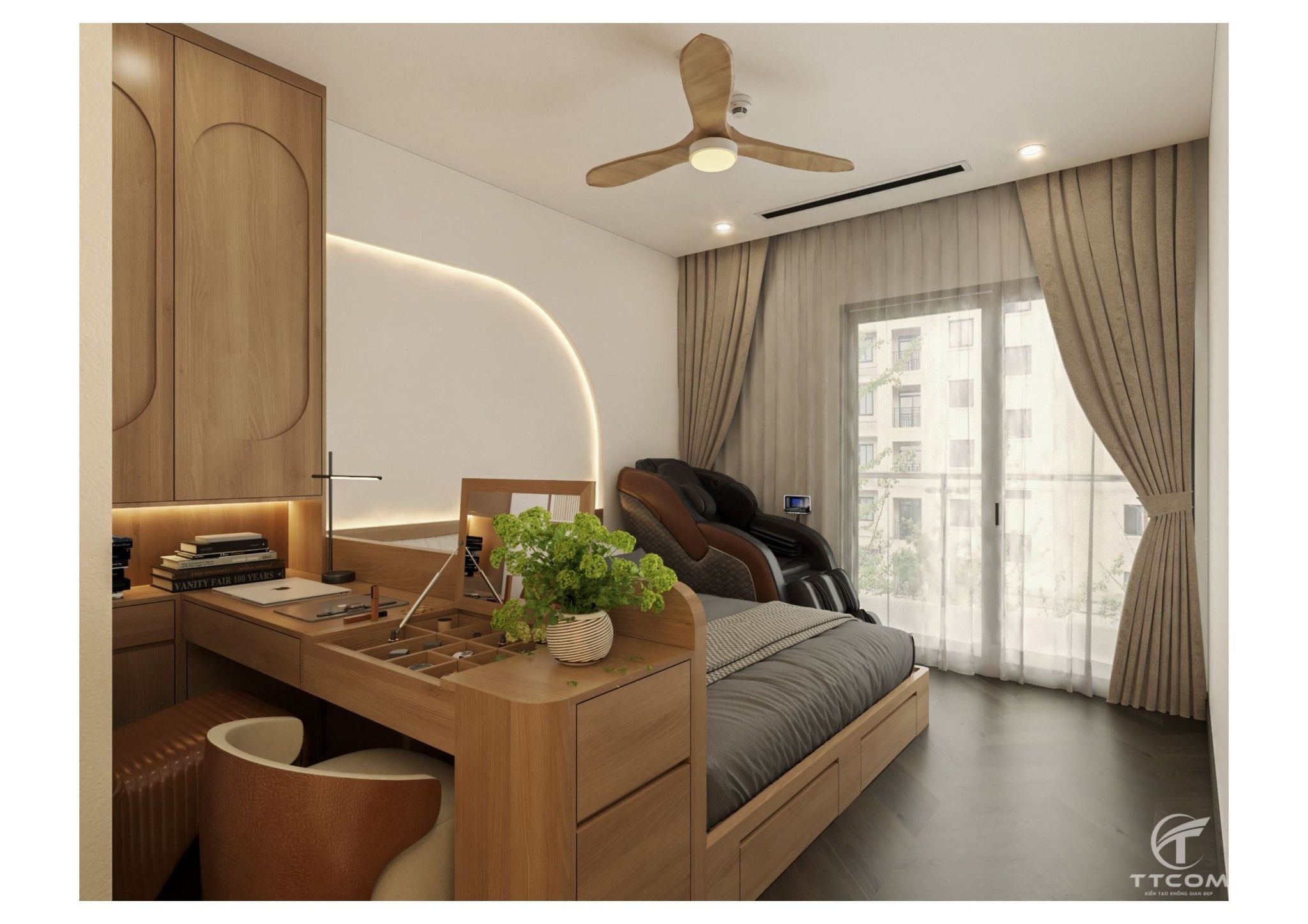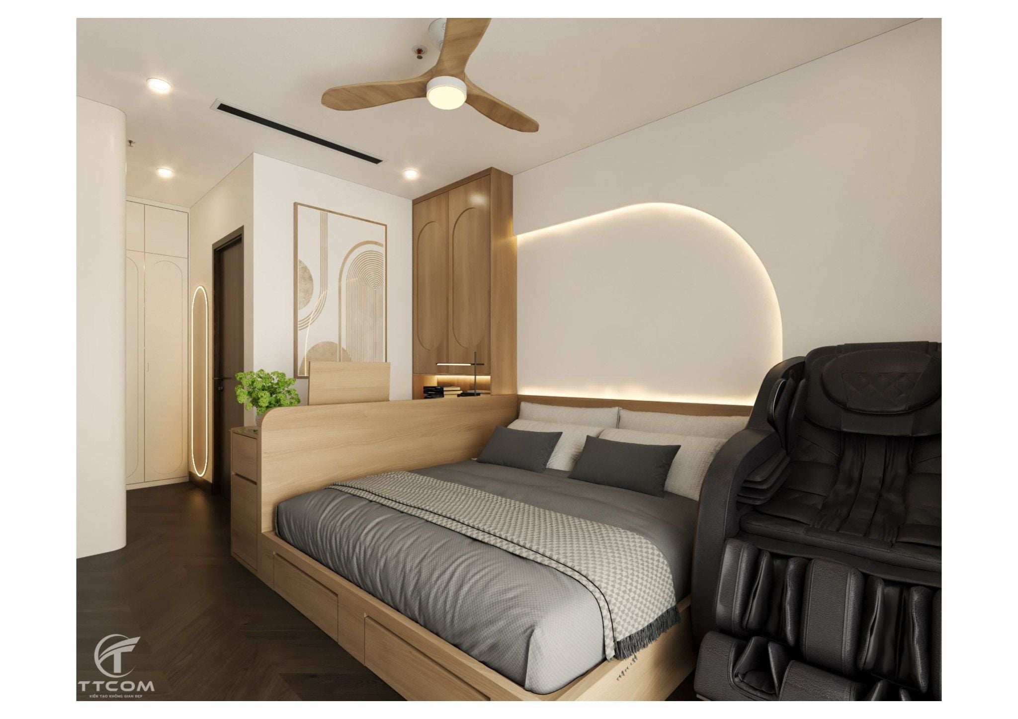 Phòng ngủ chính được thiết kế rộng rãi với giường gỗ kết hợp hệ tủ quần áo âm tường, vừa đẹp mắt vừa tối ưu diện tích. Điểm nhấn nằm ở hệ đèn hắt sáng phía đầu giường, tạo cảm giác thư giãn và ấm áp. Ngoài ra, còn có ghế massage hiện đại, mang đến trải nghiệm nghỉ ngơi tuyệt vời ngay tại nhà.