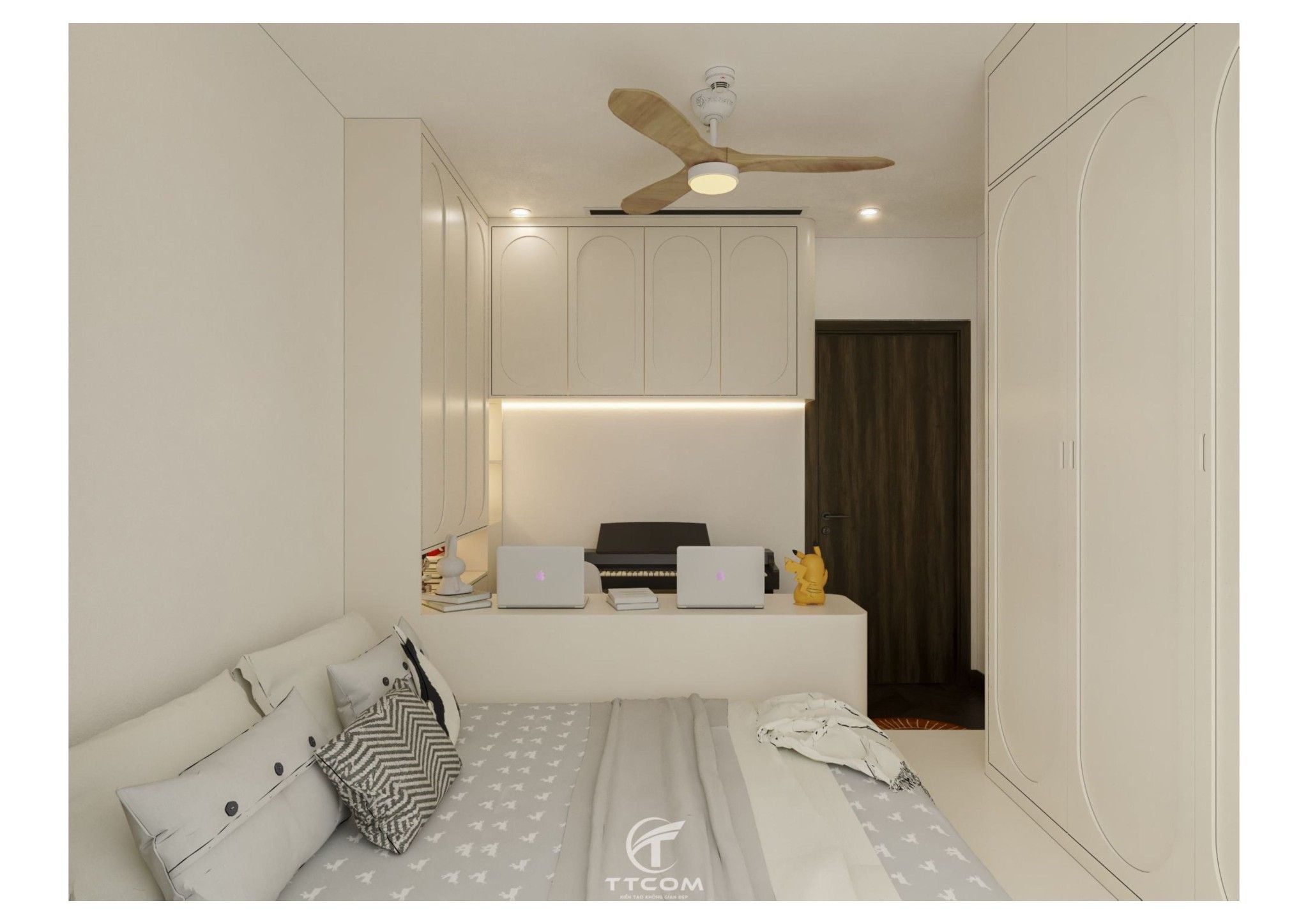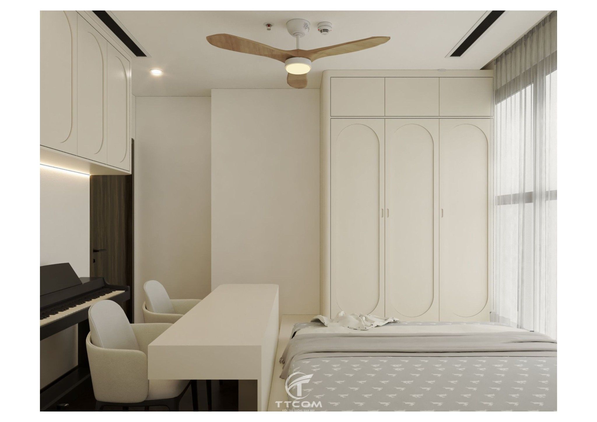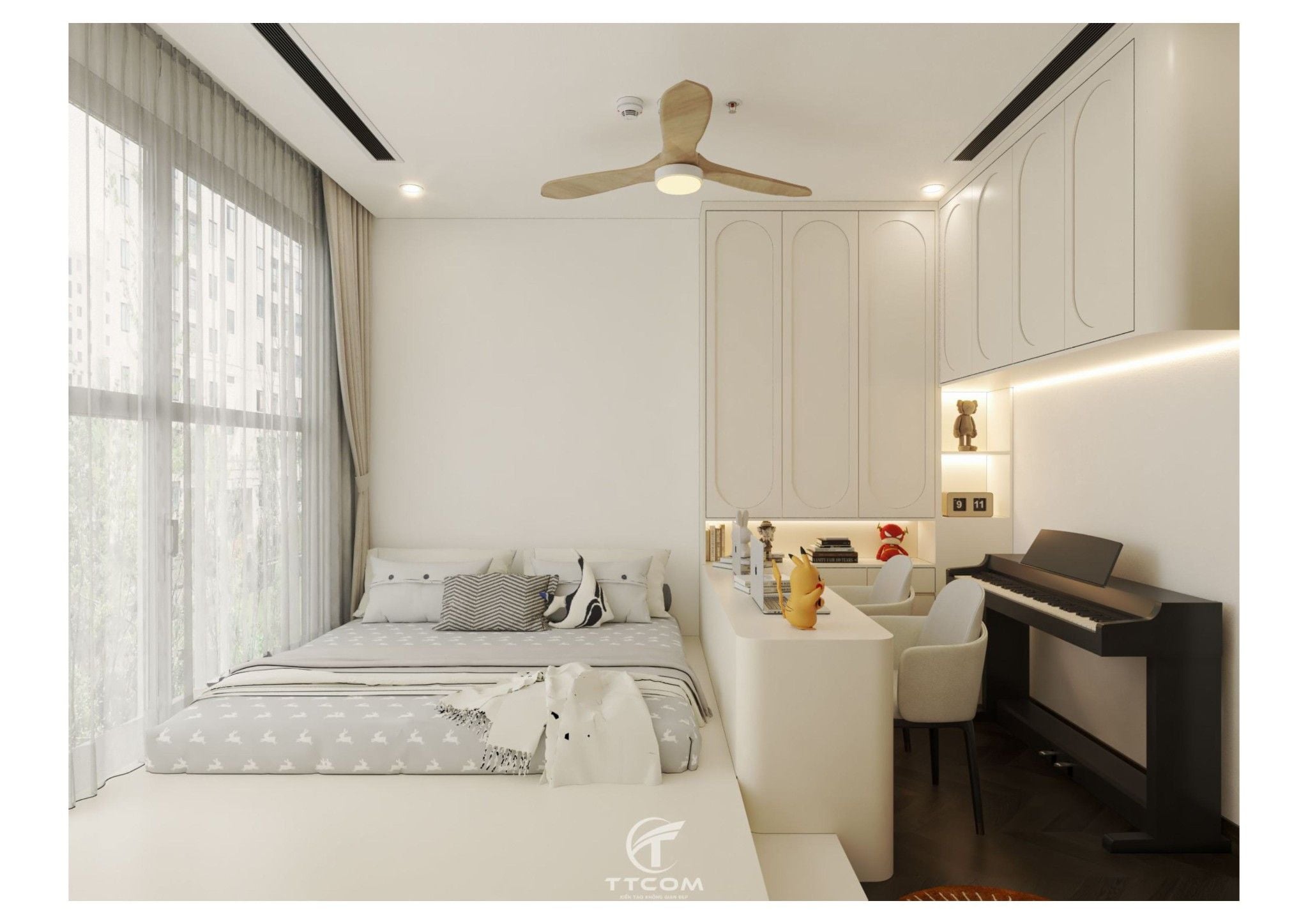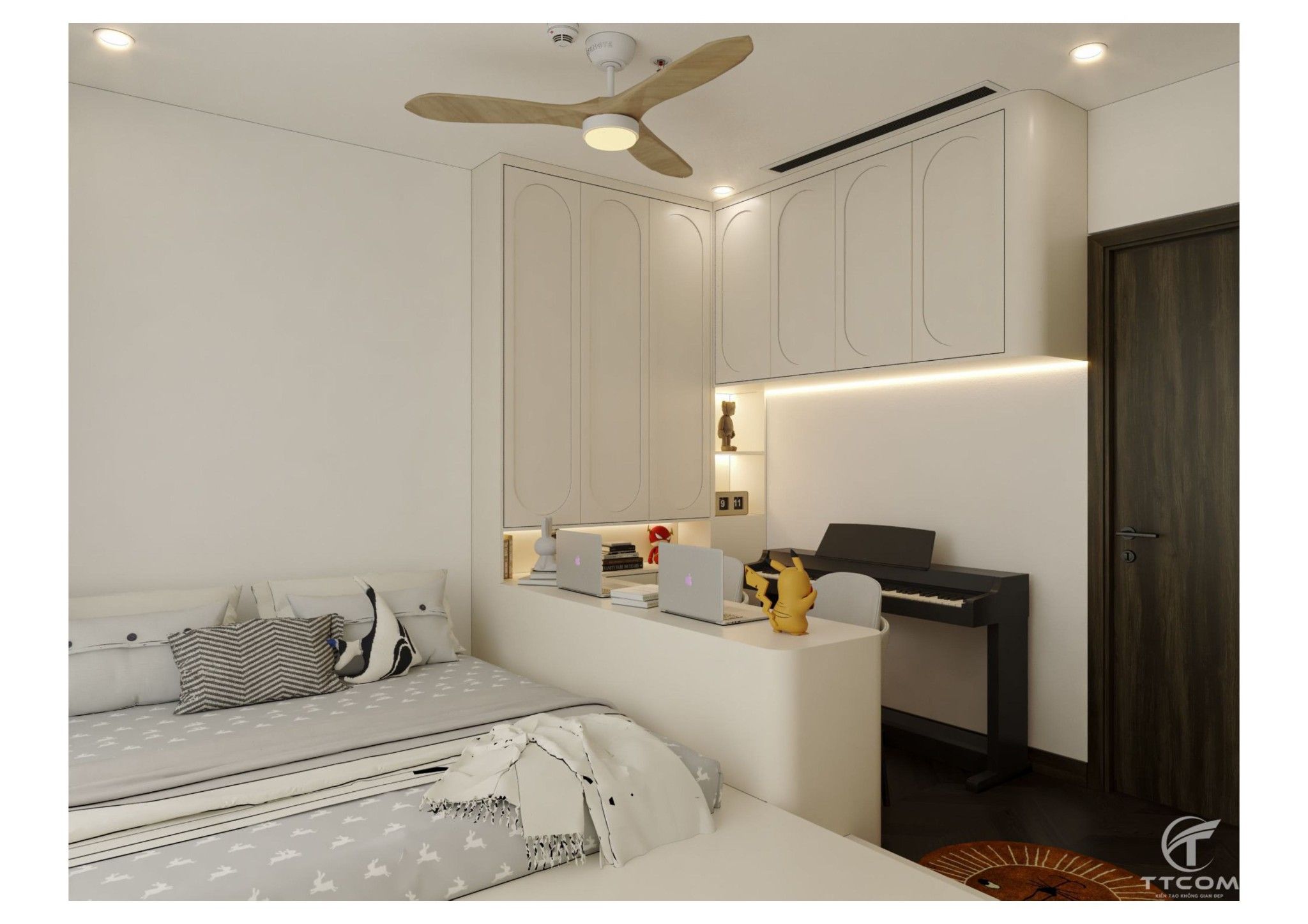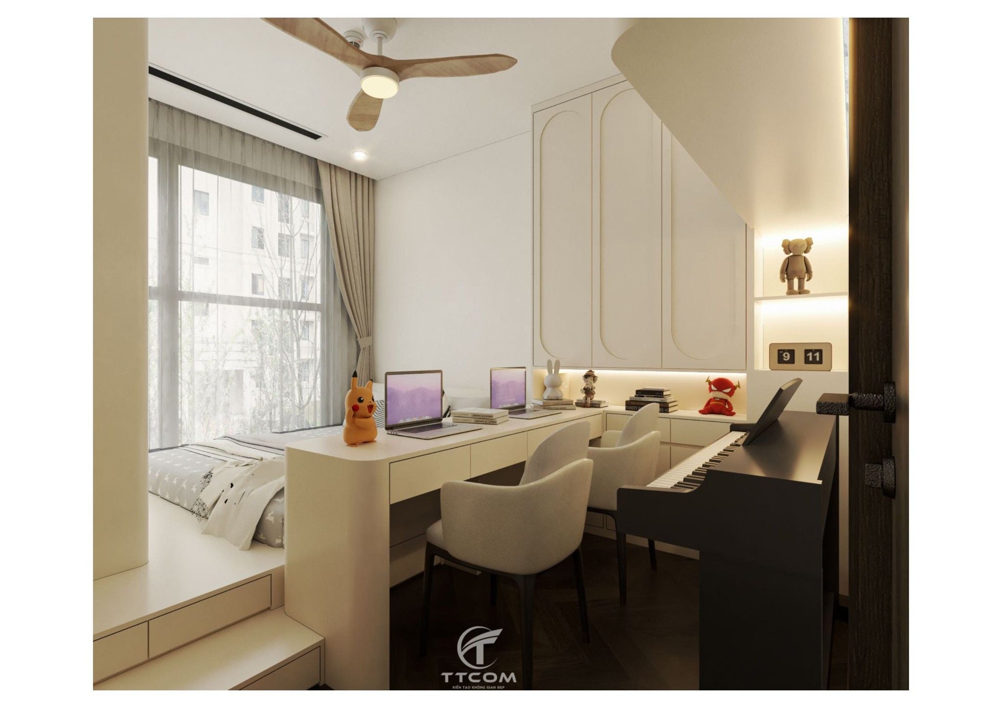 Phòng ngủ nhỏ được thiết kế thông minh dành cho trẻ em hoặc có thể sử dụng làm phòng làm việc. Giường ngủ kết hợp kệ sách, bàn học đôi và đàn piano điện tử, tạo nên một không gian đa chức năng, vừa học tập, vừa giải trí.