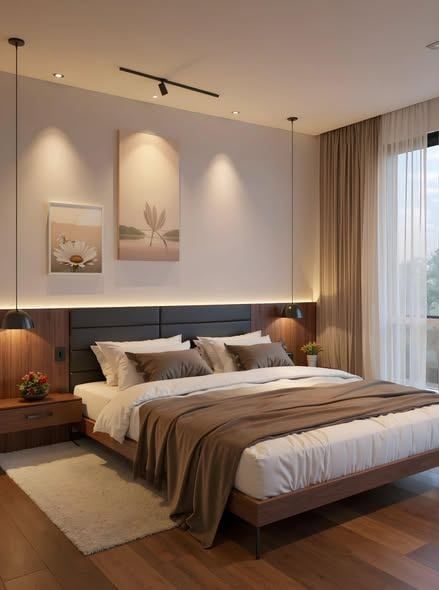 Giường gỗ thấp, tranh tường nhẹ nhàng và rèm cửa màu kem giúp không gian trở nên thư giãn, tạo cảm giác an yên sau ngày dài làm việc.