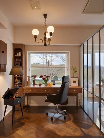 Thiết kế cửa sổ lớn đón ánh sáng tự nhiên, kết hợp bàn làm việc gỗ mộc mạc và ghế da cao cấp.
