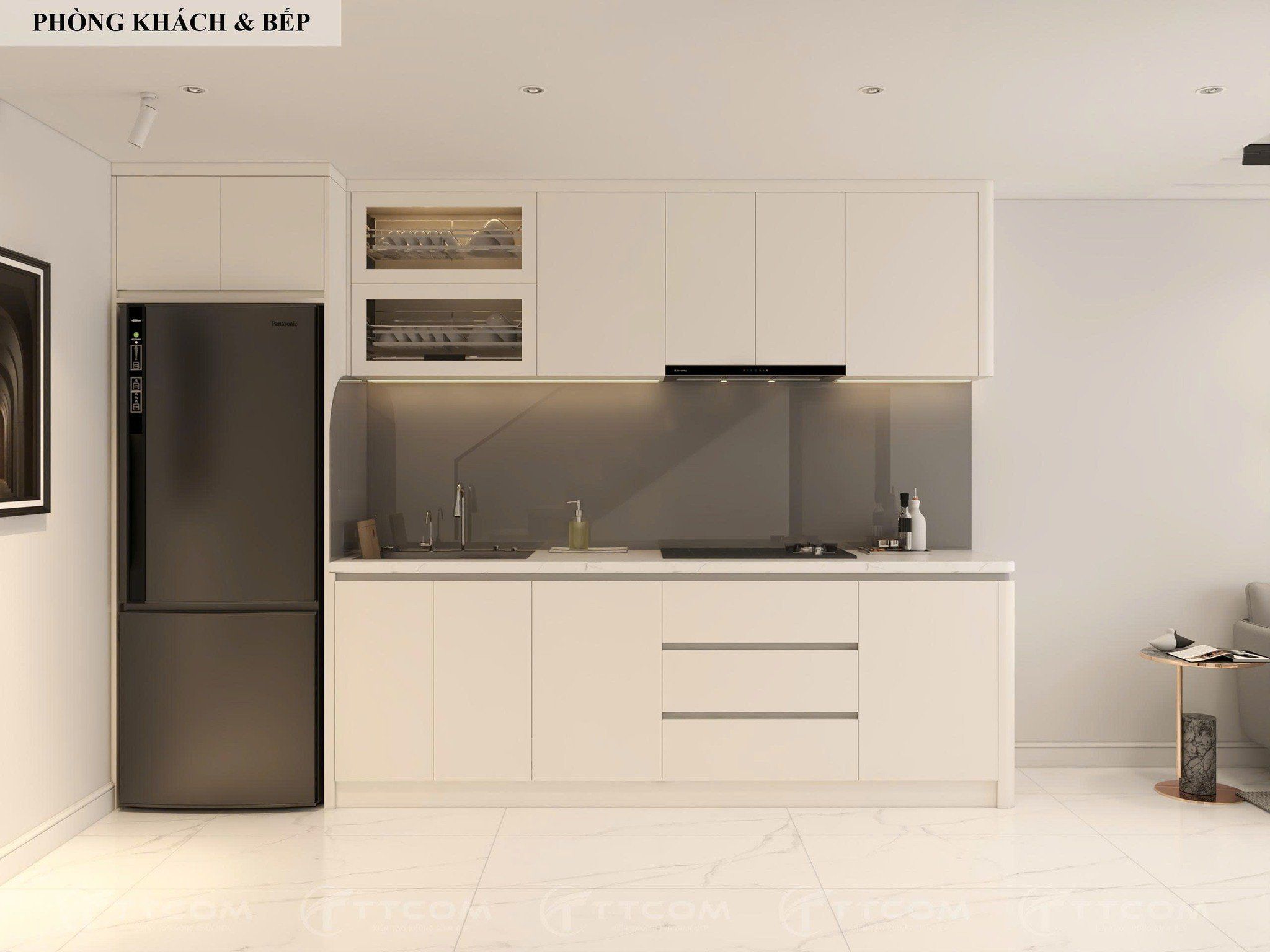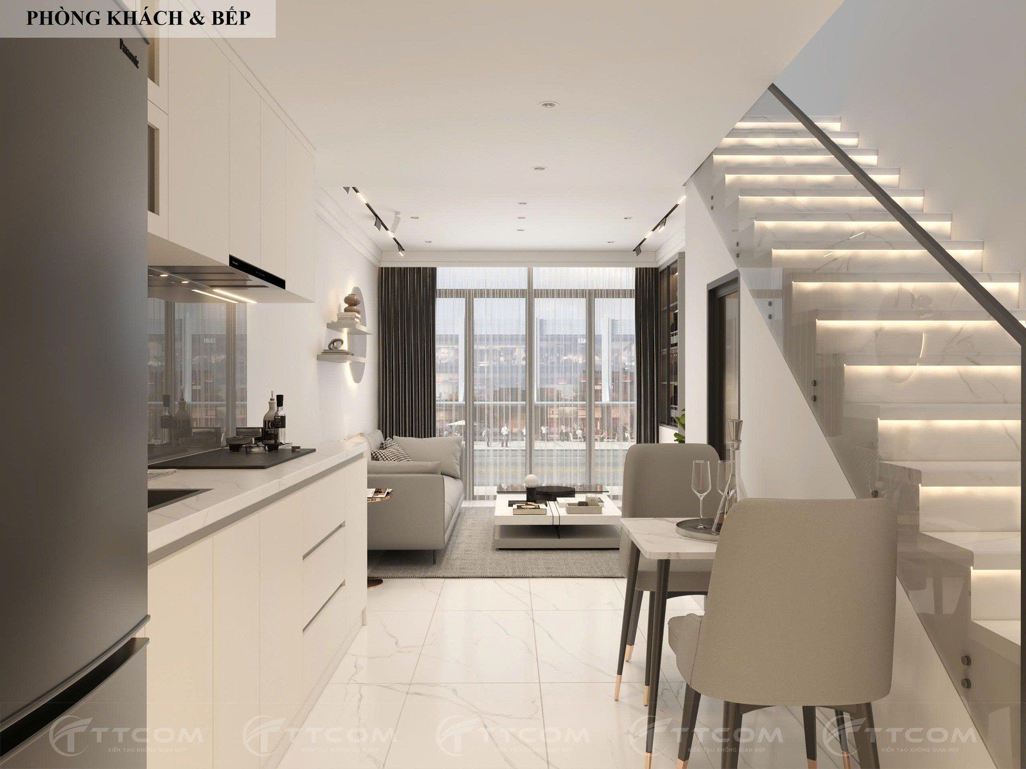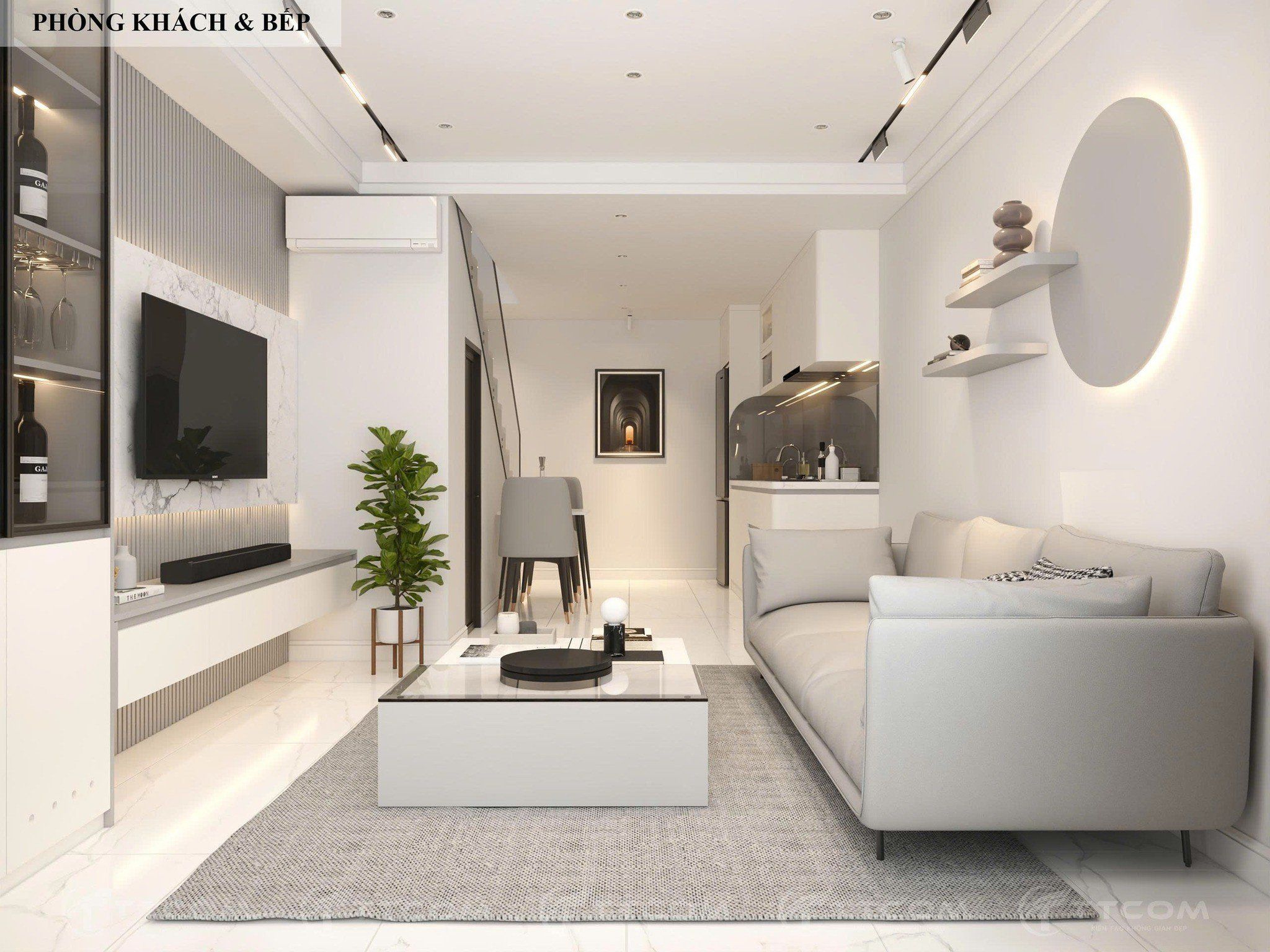 Không gian phòng khách – bếp được thiết kế mở, tạo sự liên kết và thoáng đãng. Gam màu trắng – xám chủ đạo kết hợp ánh sáng tự nhiên từ hệ cửa kính lớn giúp căn nhà thêm rộng rãi, hiện đại.