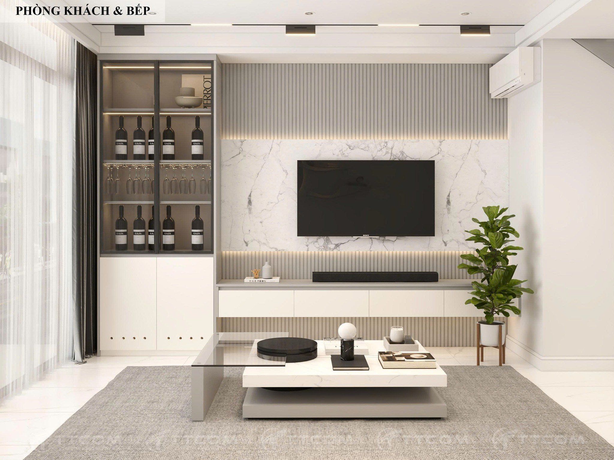 Sofa, bàn trà, kệ tivi thiết kế tối giản, mang lại sự tinh tế.
