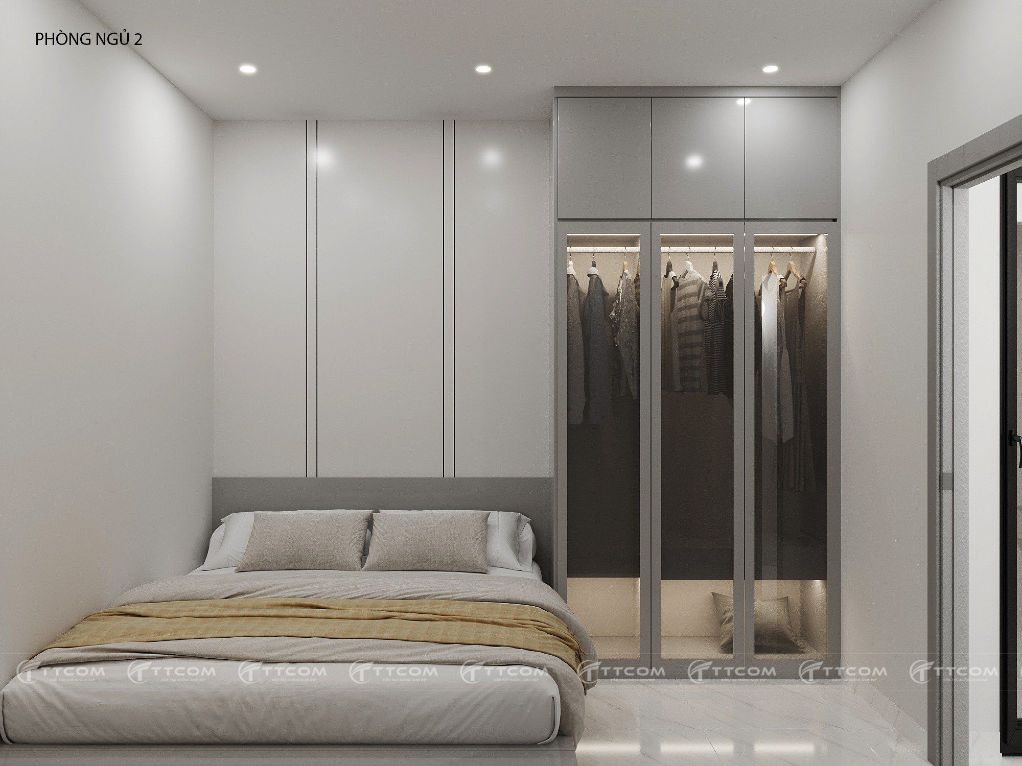 Phòng ngủ phụ tối ưu diện tích với giường đôi và tủ quần áo cửa kính mờ. Thiết kế ánh sáng nhân tạo kết hợp hộc tủ âm tường, tạo chiều sâu và cảm giác sang trọng.