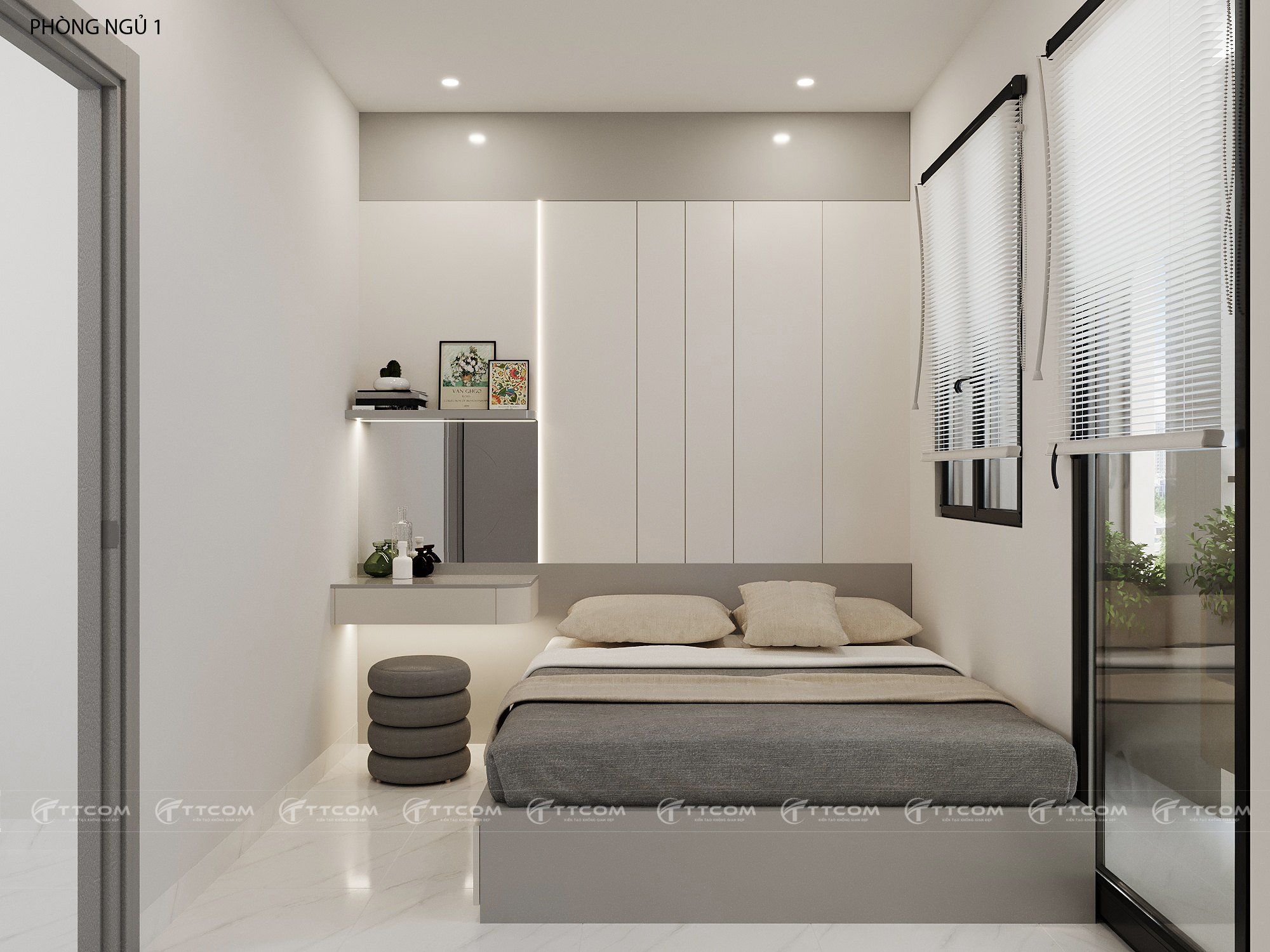 Phòng ngủ master chú trọng sự tiện nghi: giường bọc nệm, tủ quần áo kịch trần kết hợp bàn trang điểm nhỏ gọn. Màu sắc nhẹ nhàng, đem lại cảm giác thư giãn, thoải mái sau một ngày dài.
