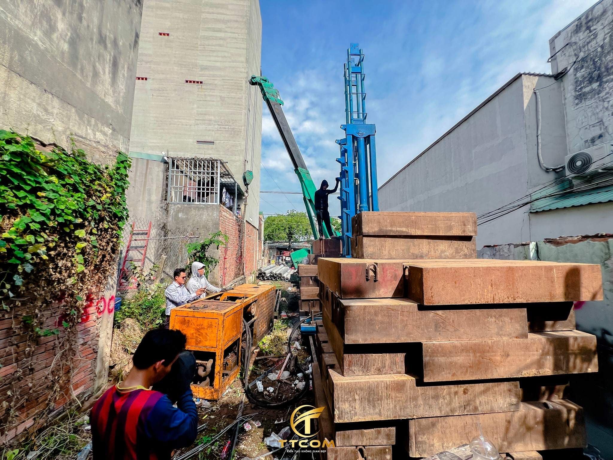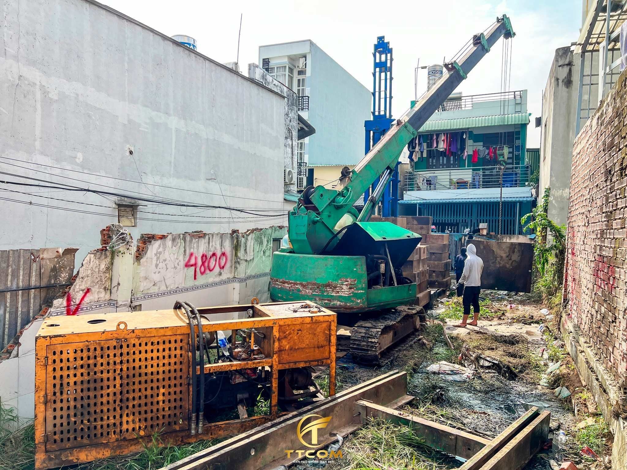 Ép cọc là bước khởi đầu mang tính then chốt, đặc biệt với các công trình nhà phố nhiều tầng, có tầng hầm. Tại dự án này, TTCOM Group triển khai thi công với quy trình nghiêm ngặt: