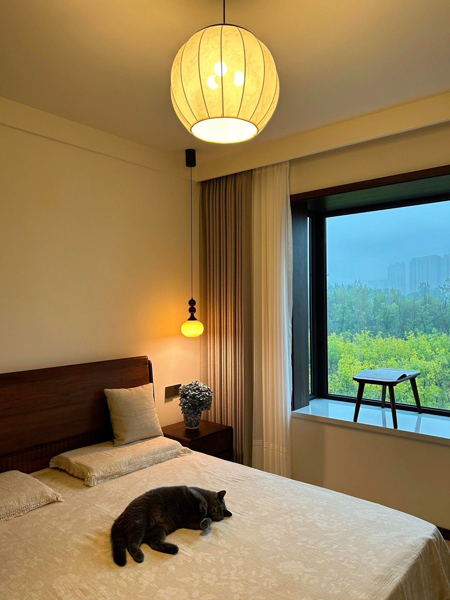Cửa sổ lớn mang ánh sáng tự nhiên vào phòng, kết hợp với gam màu kem – nâu nhẹ nhàng giúp tạo cảm giác thư thái.