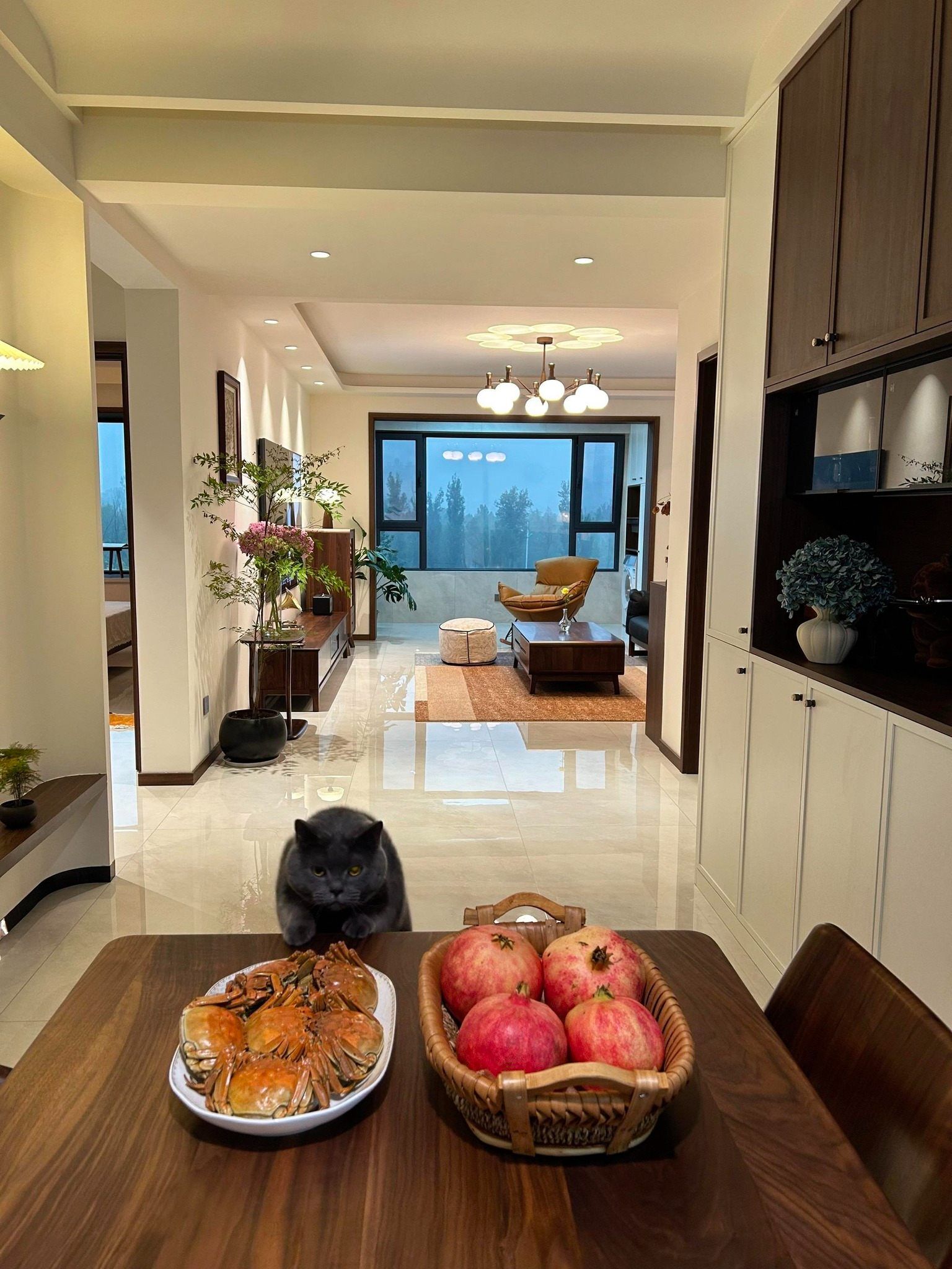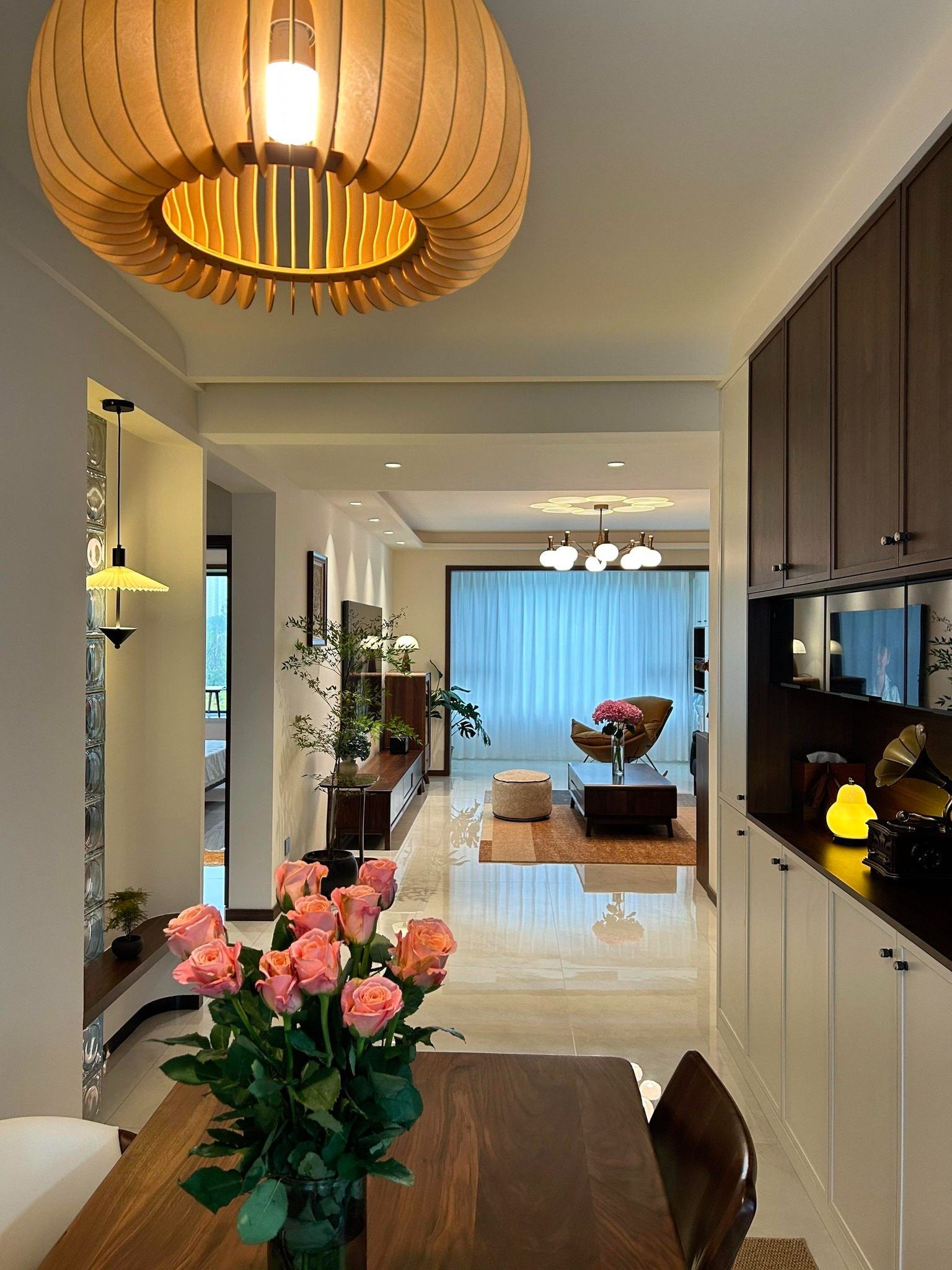 Ánh đèn thả ấm áp cùng lọ hoa hồng tươi khiến không gian trở nên thân mật và gần gũi, là nơi lý tưởng cho những bữa cơm gia đình ấm cúng.
