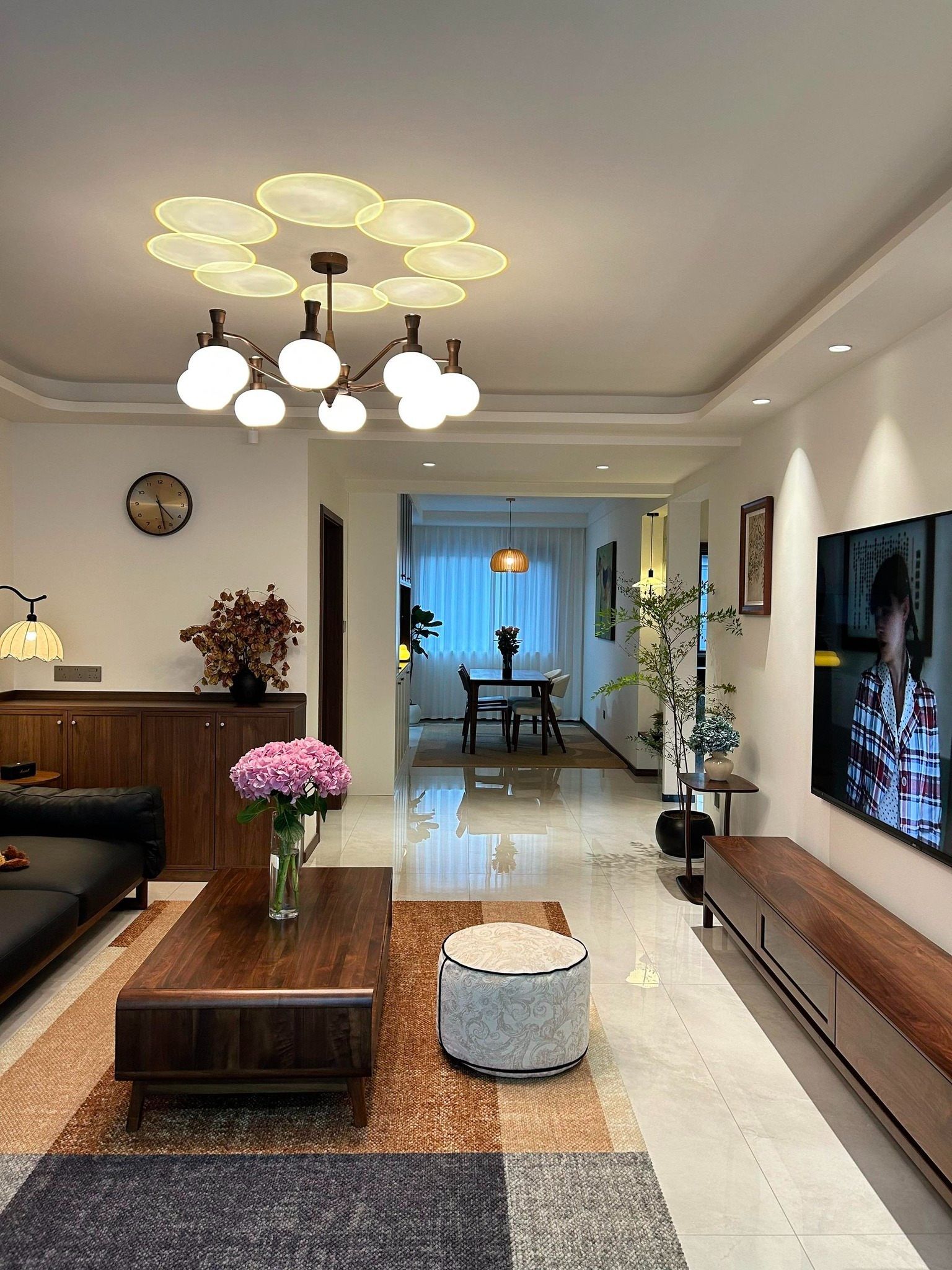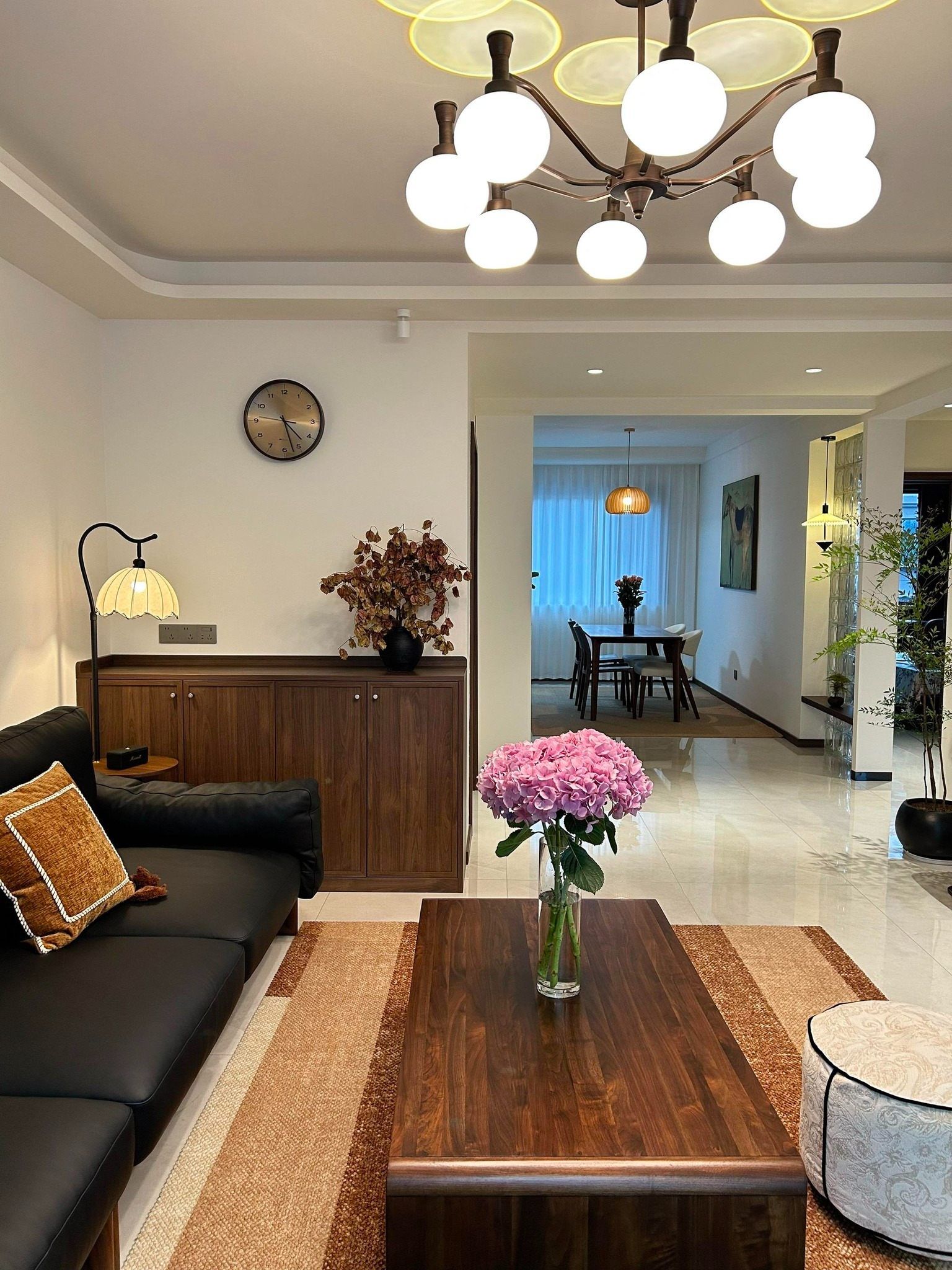 Chi tiết trang trí như bình hoa, đèn trần, thảm trải sàn giúp không gian thêm sinh động nhưng vẫn giữ nét tinh tế.