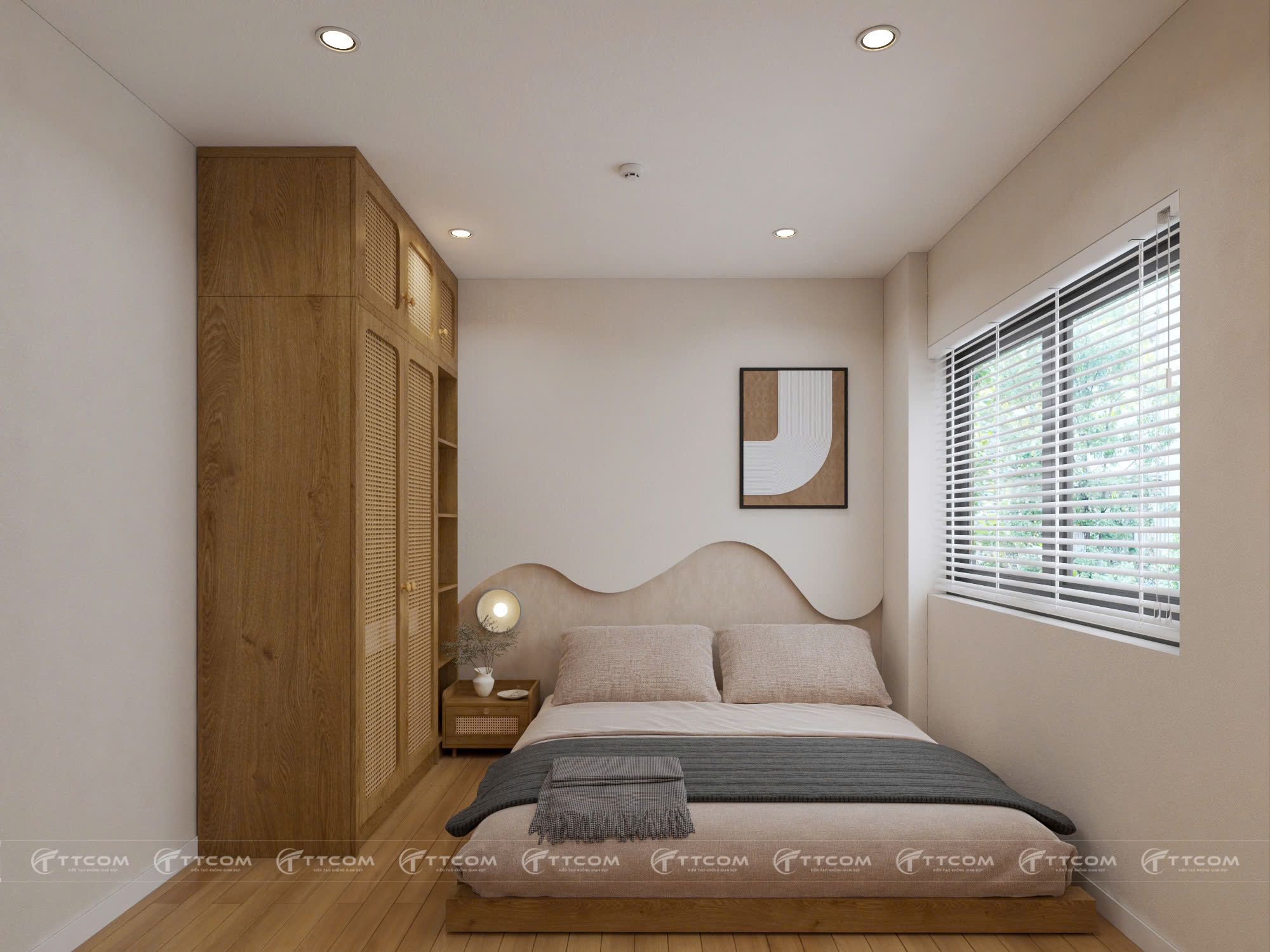 Giường ngủ: thiết kế đầu giường bo tròn mềm mại.