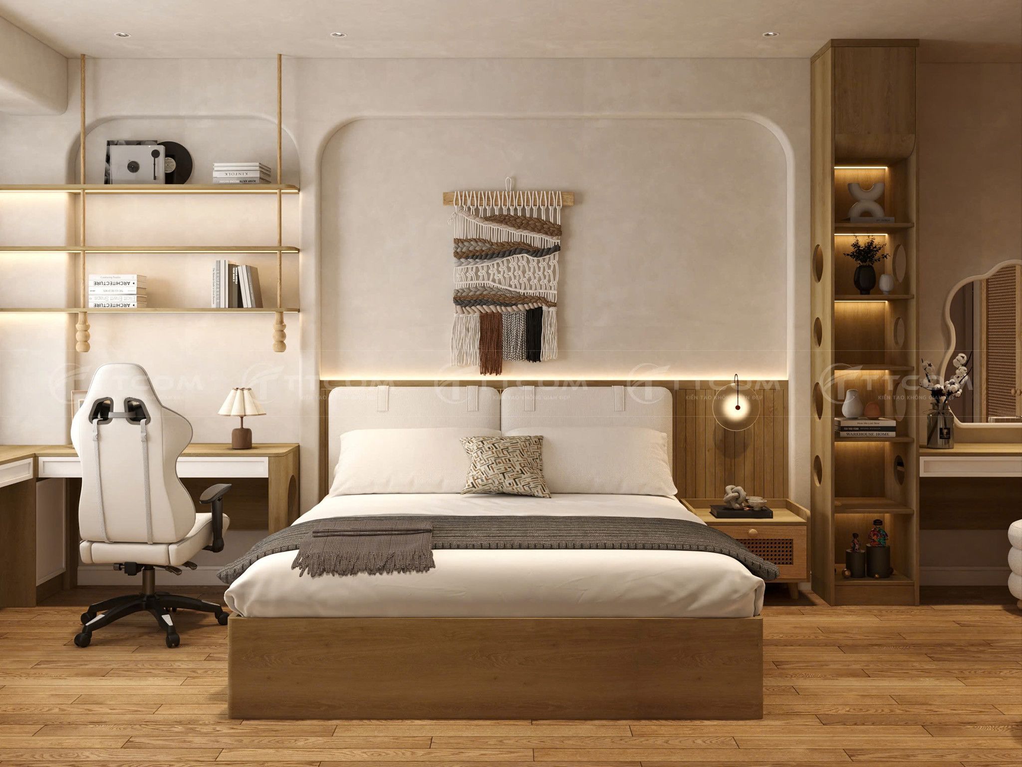 Tone màu chủ đạo: trắng kem, be và nâu gỗ, mang lại cảm giác thư thái, nhẹ nhàng.