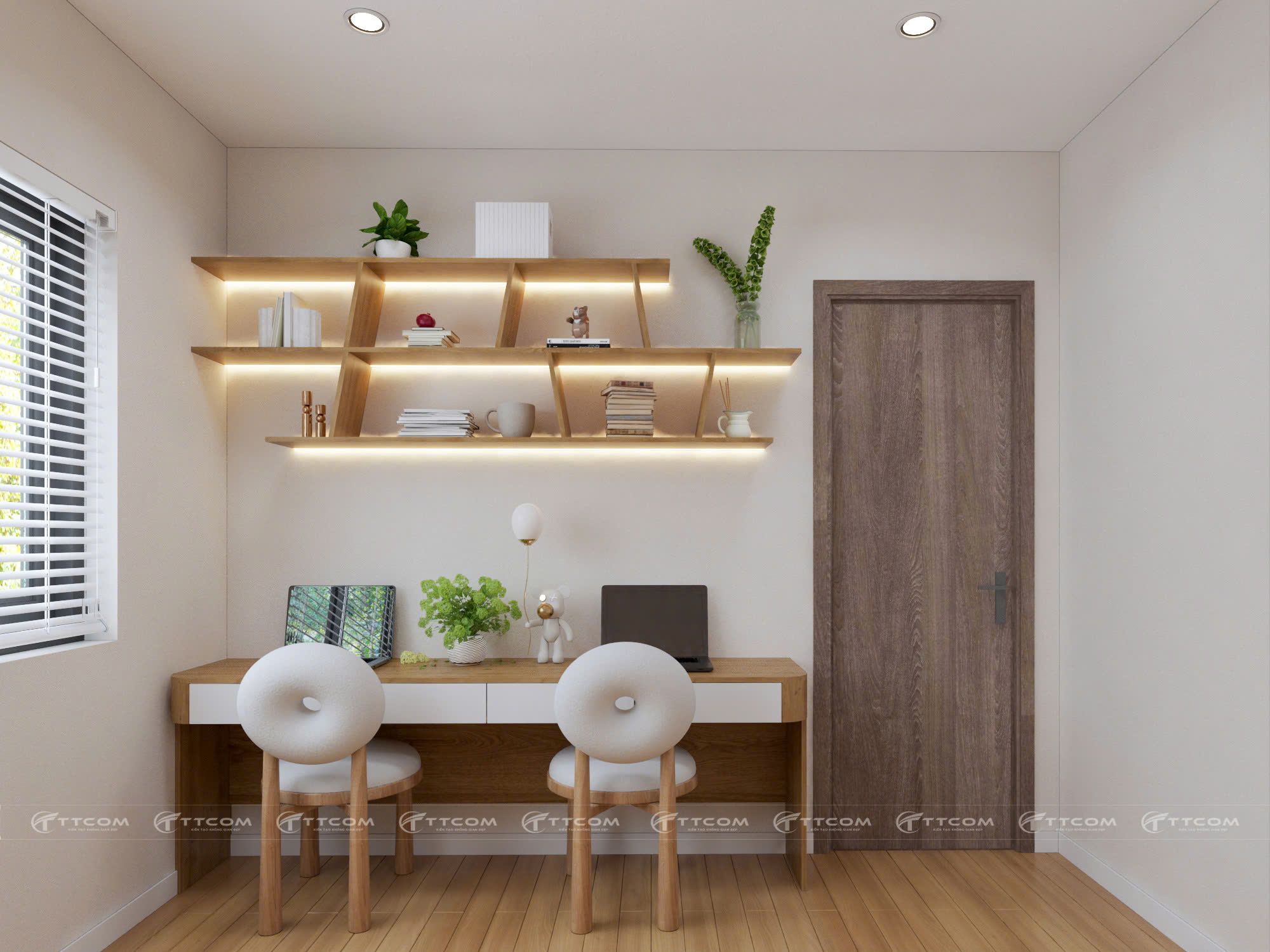 Bàn học/ làm việc: thiết kế gọn gàng cạnh cửa sổ, tận dụng ánh sáng.