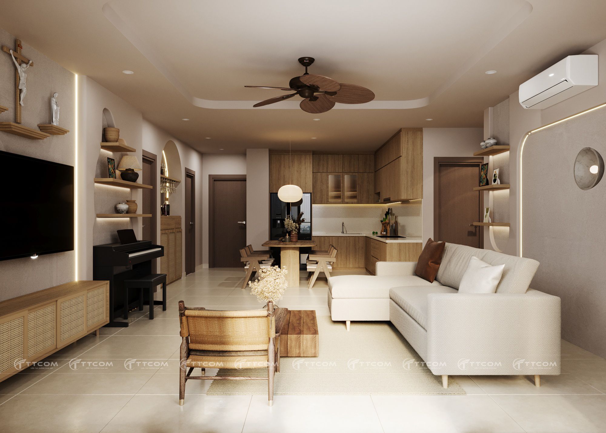 Nội thất: sofa chữ L đơn giản, kệ TV kết hợp gỗ mây, quạt trần decor, piano tạo điểm nhấn nghệ thuật.