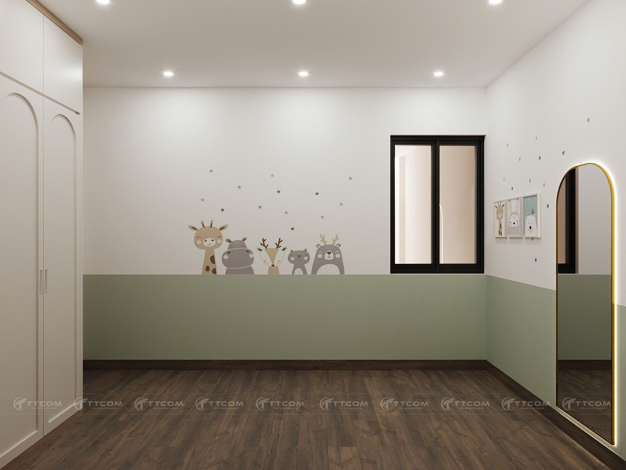 Gam màu sáng trắng, be, xanh pastel giúp không gian nhẹ nhàng mà vẫn gần gũi với trẻ em.