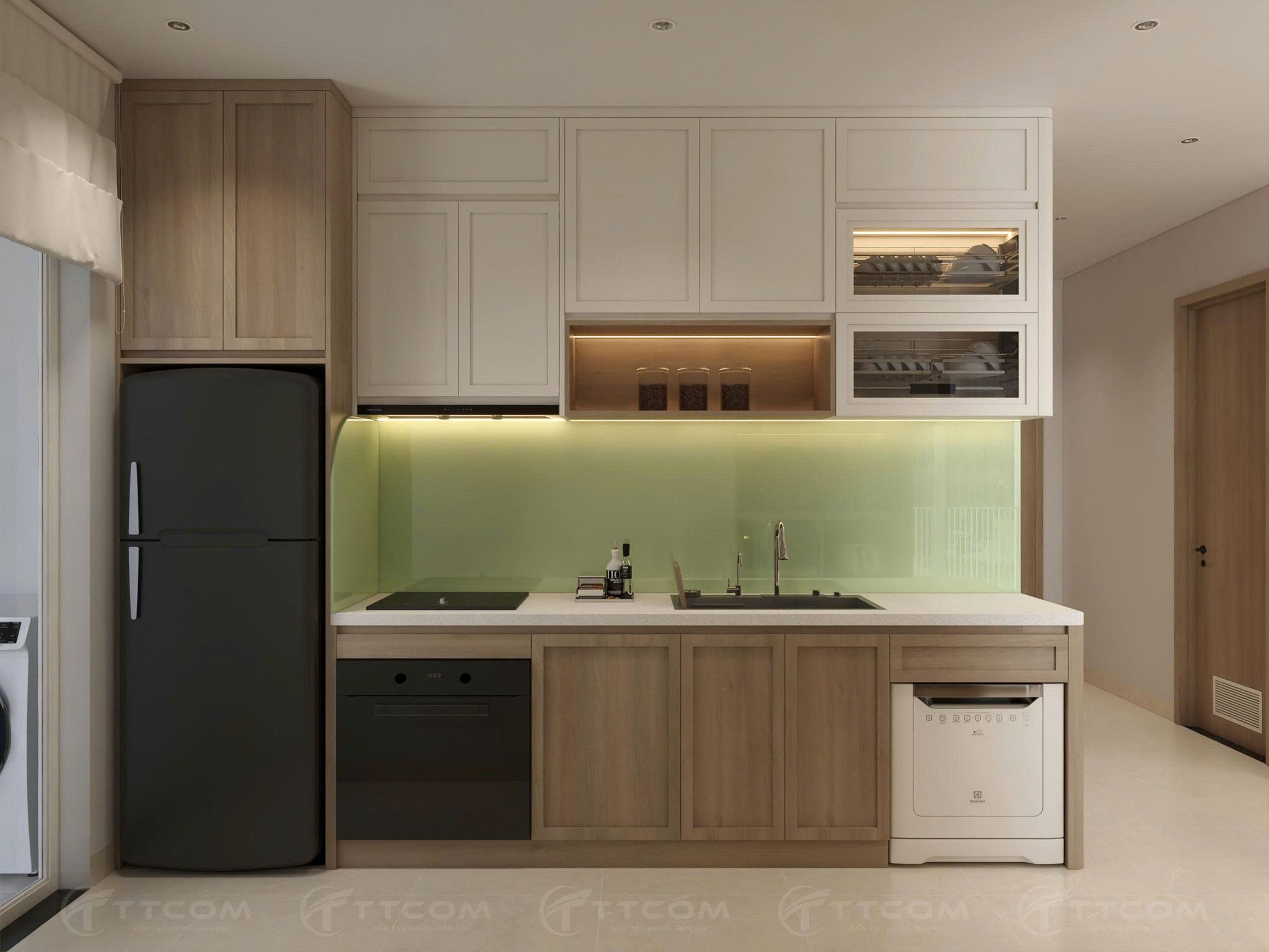 Bếp hiện đại, gọn gàng và tối ưu diện tích.