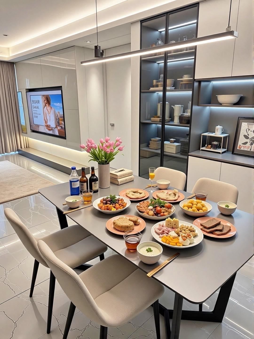 Phòng ăn trở thành tâm điểm gắn kết các thành viên, nơi những bữa ăn ấm cúng được chuẩn bị chu đáo.