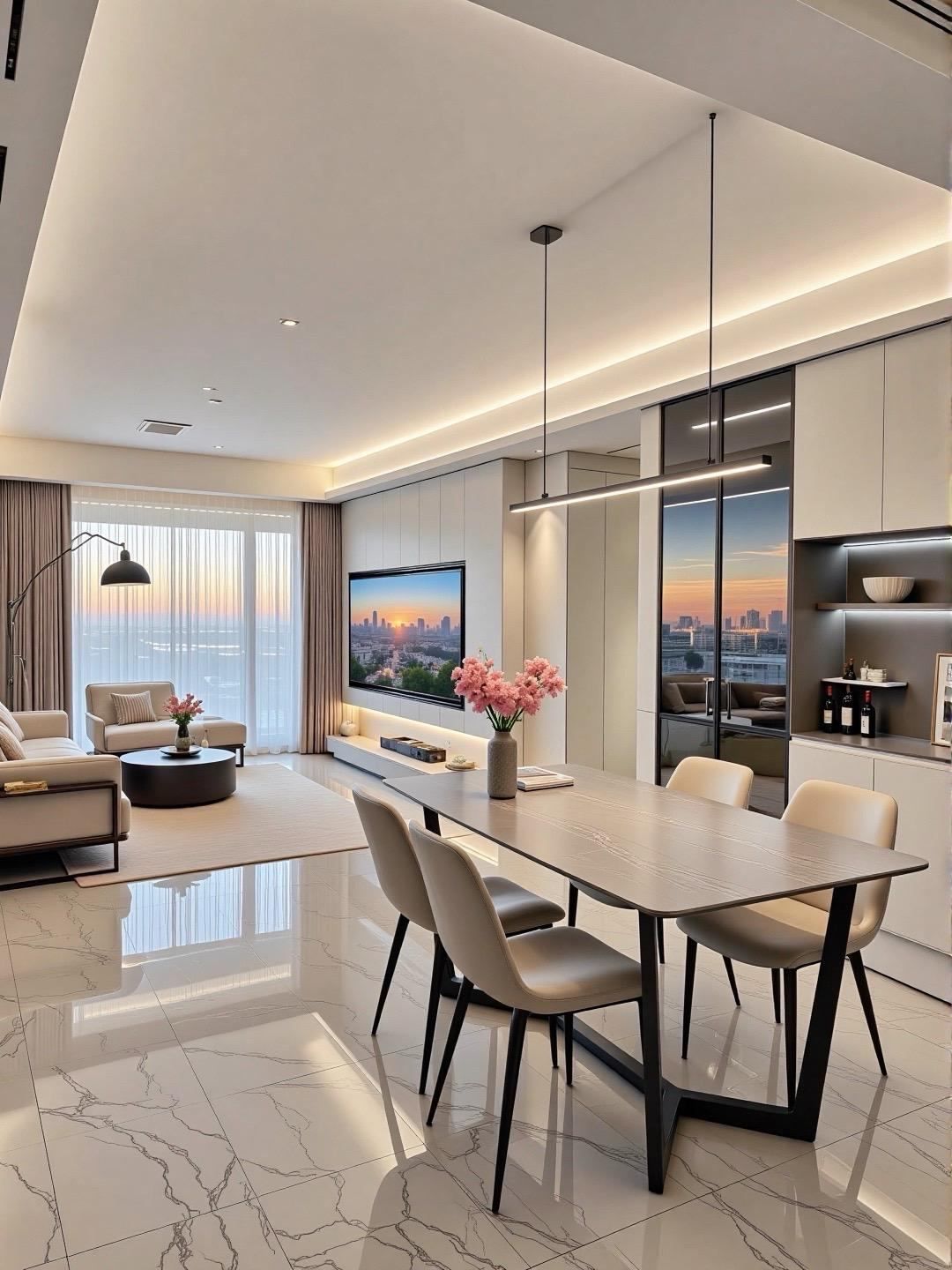 Khám phá mẫu thiết kế nội thất căn hộ hiện đại với không gian phòng khách – phòng ăn – phòng ngủ sang trọng, tối giản và tiện nghi. Bố cục mở, ánh sáng tinh tế, nội thất cao cấp mang đến trải nghiệm sống đẳng cấp.