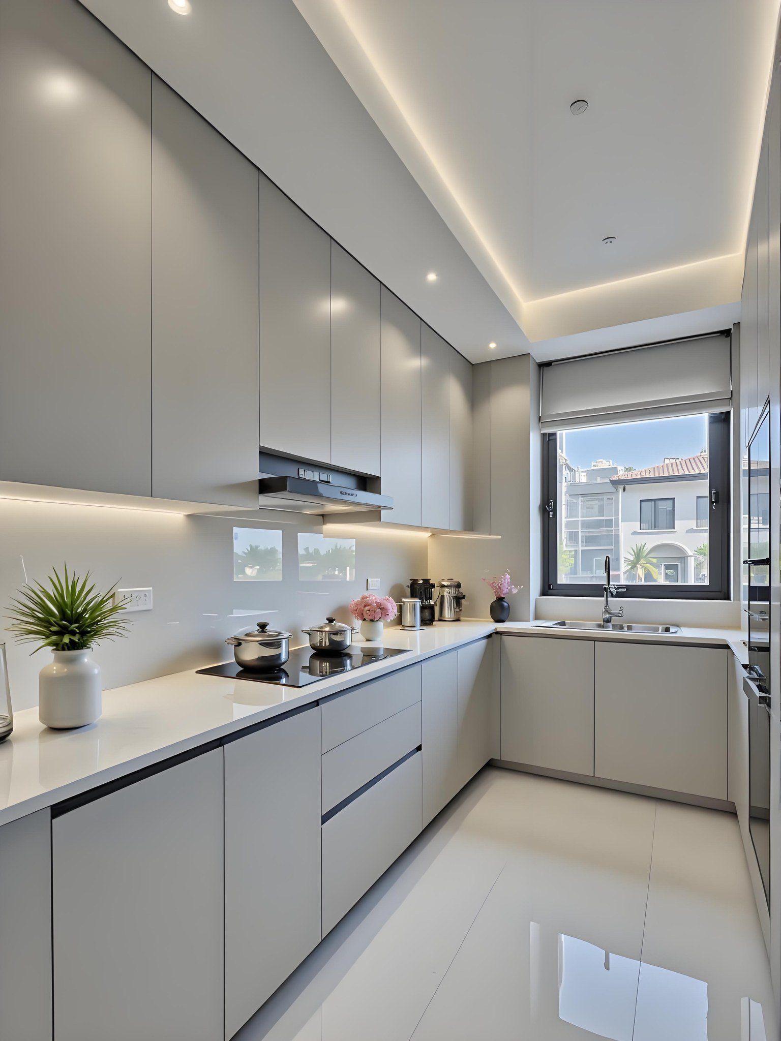 Tủ bếp kịch trần màu xám nhạt, chống bám bẩn, dễ lau chùi.