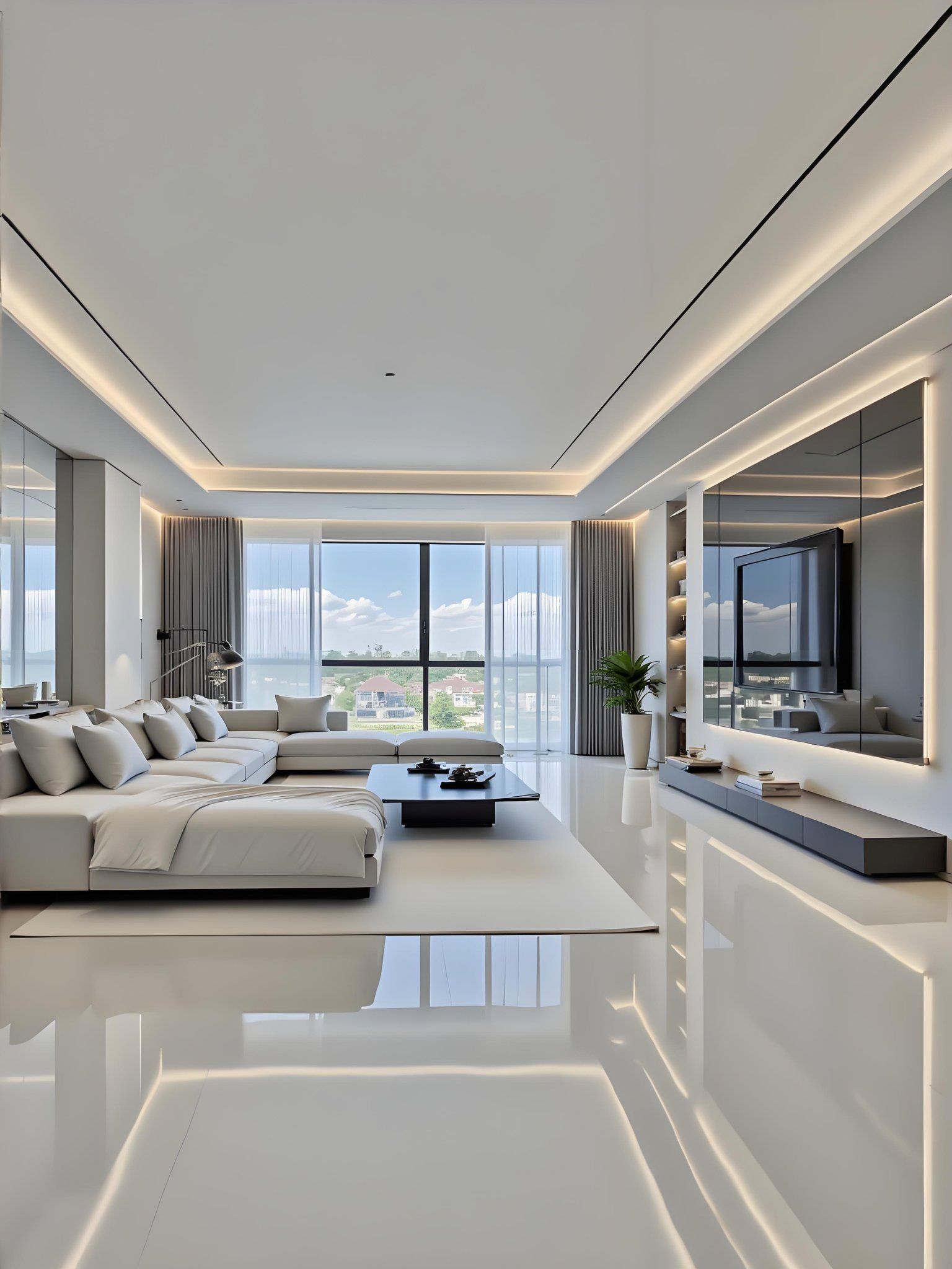 Phòng khách được thiết kế với phong cách minimalist hiện đại, gam màu trắng – xám chủ đạo tạo cảm giác rộng rãi và sáng thoáng.