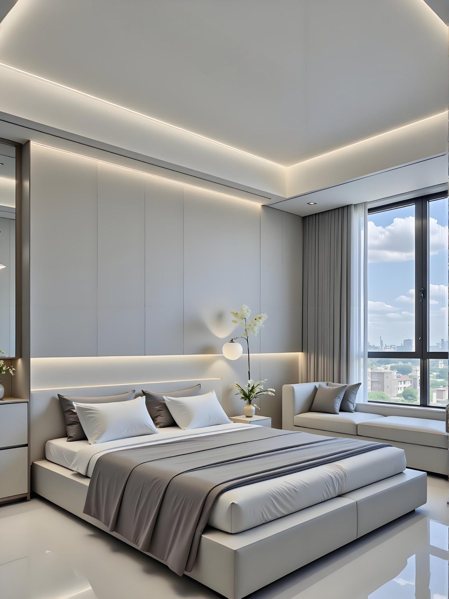 Giường bọc nệm tông trắng – xám, tạo cảm giác mềm mại.
