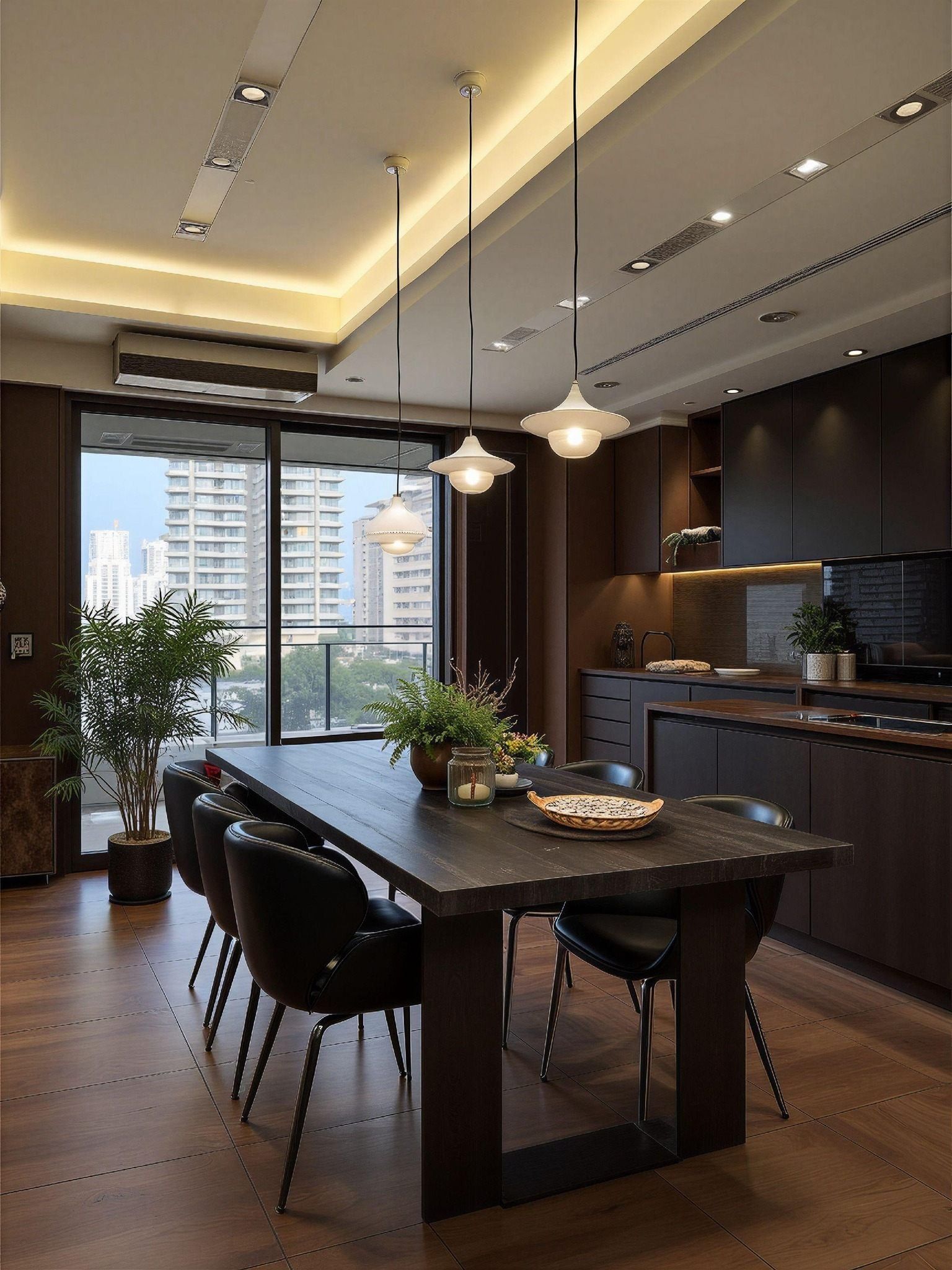 Bàn ăn gỗ và ghế da đen hiện đại
