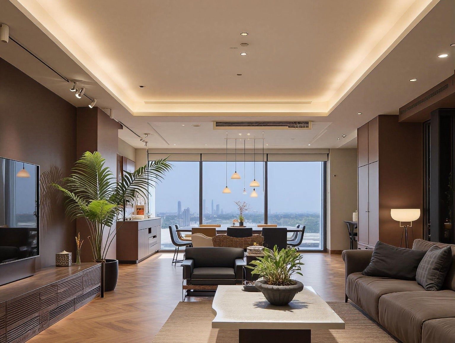 Phòng khách được thiết kế theo phong cách modern luxury với gam màu nâu đen be tạo cảm giác sang trọng và thư giãn. Ánh sáng vàng ấm kết hợp chất liệu gỗ giúp tổng thể trở nên hài hòa và tinh tế.