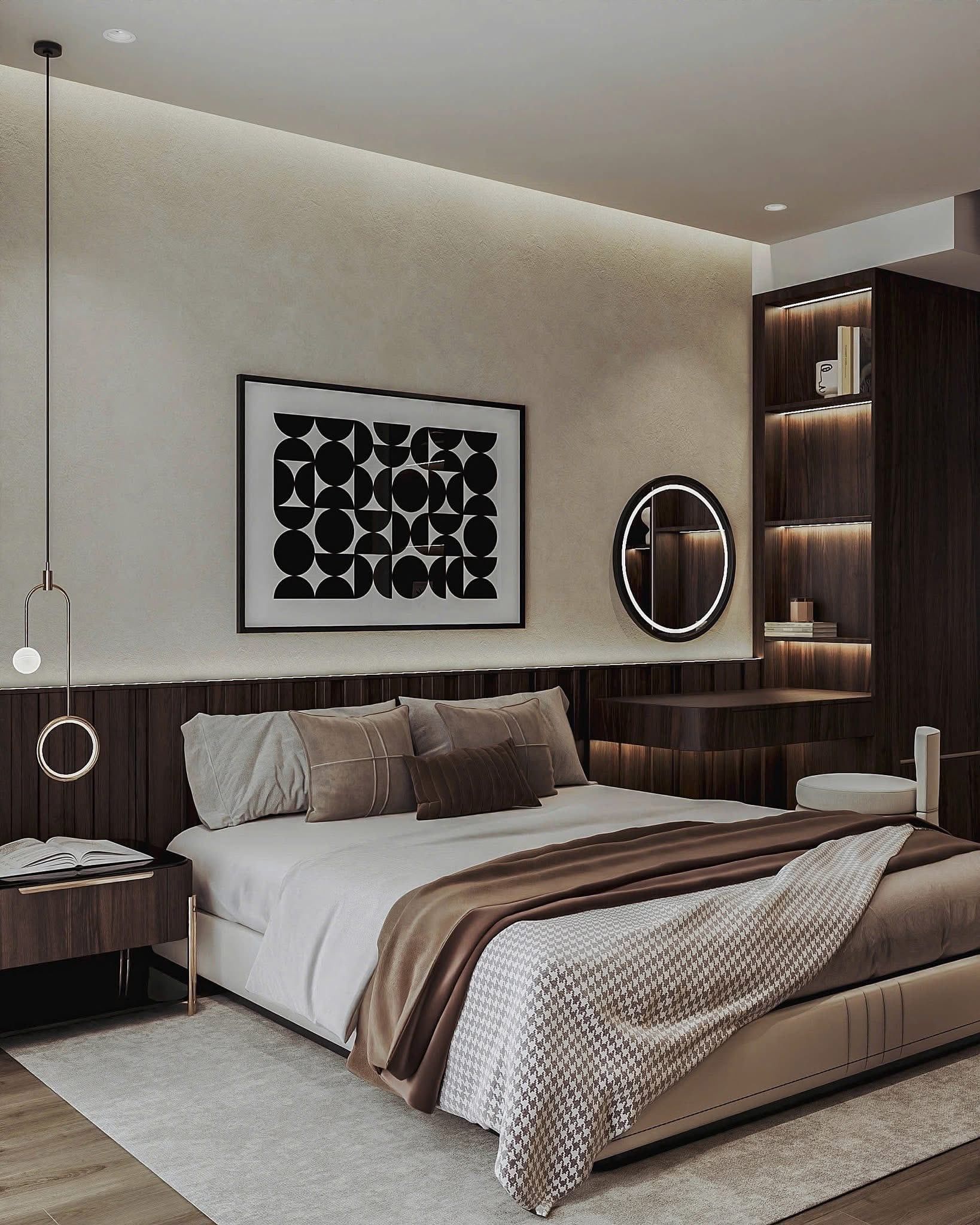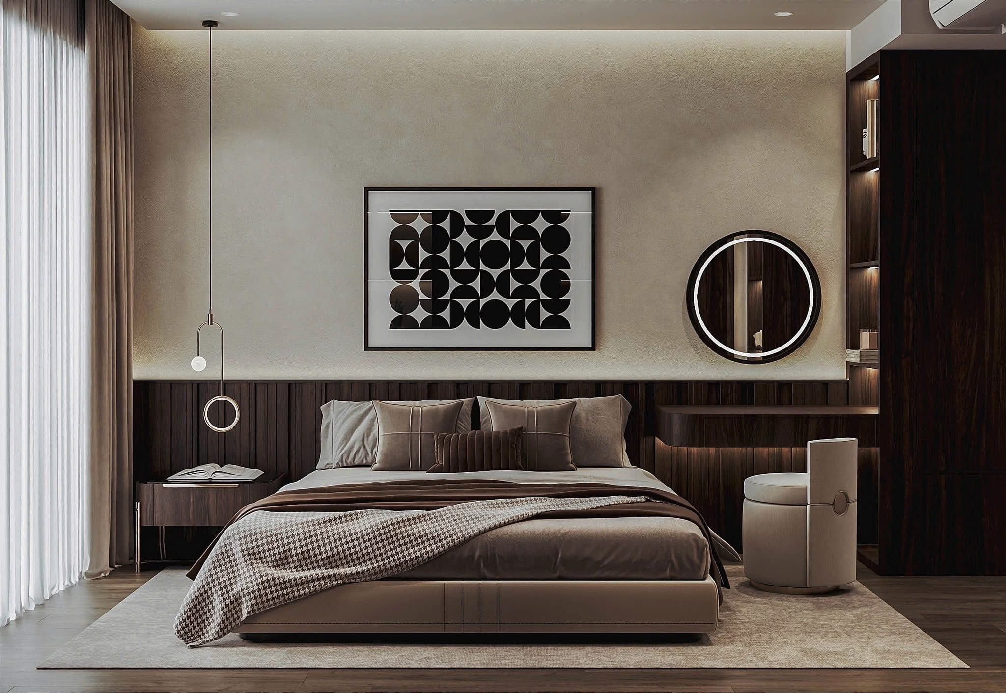 - Mảng đầu giường ốp gỗ kết hợp đèn thả trang trí tinh tế