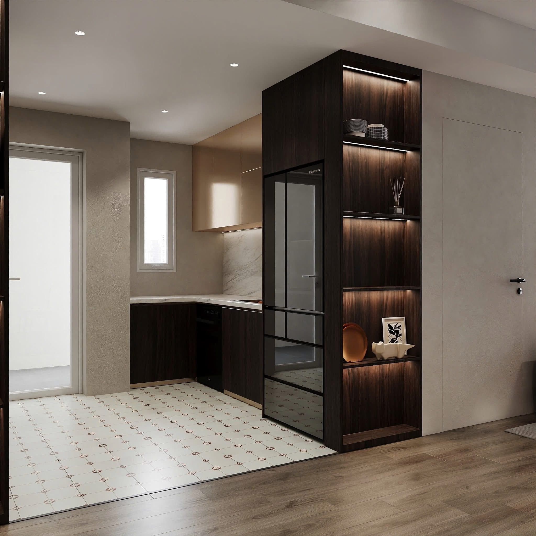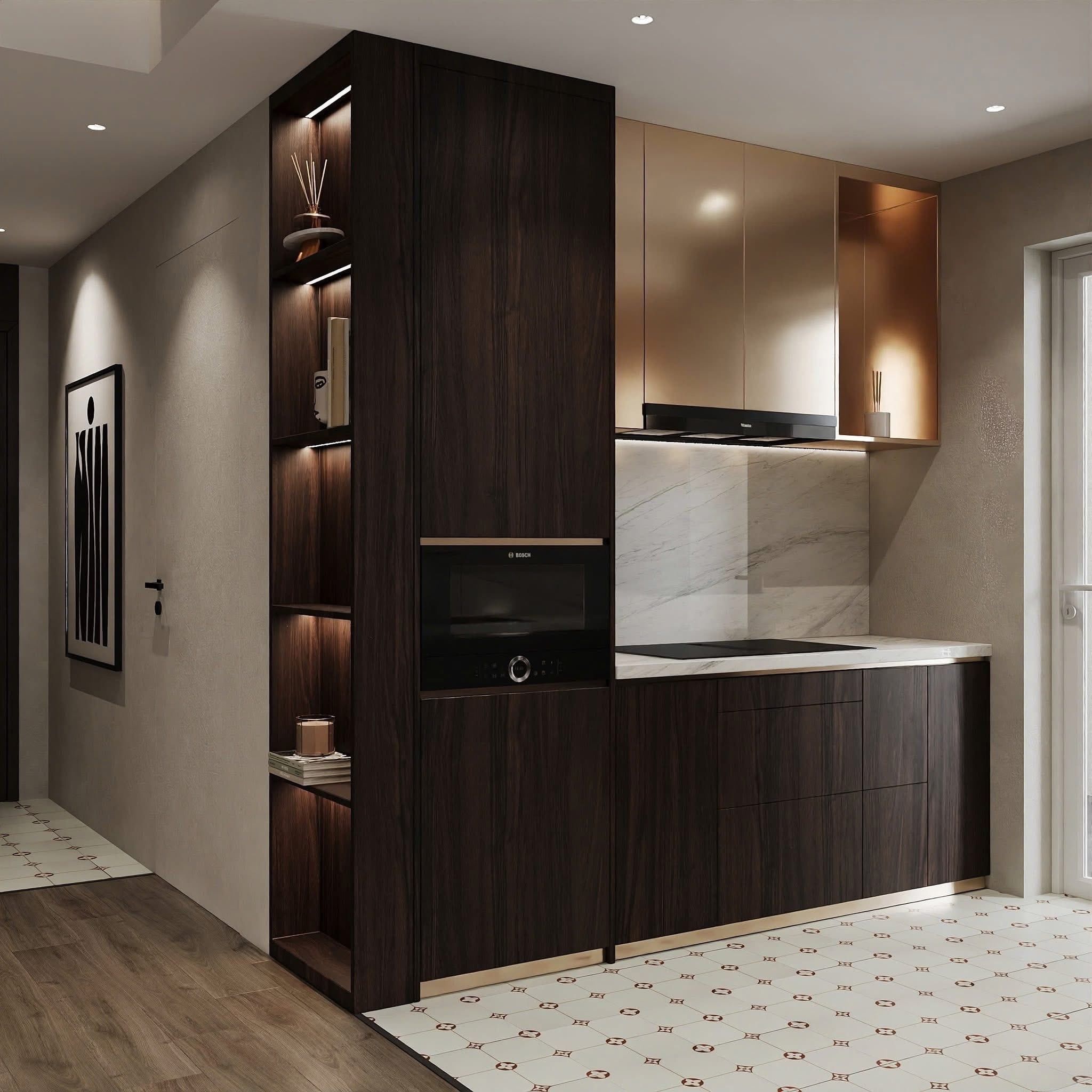 - Hệ tủ bếp gỗ tối màu kết hợp cánh tủ màu trung tính hiện đại