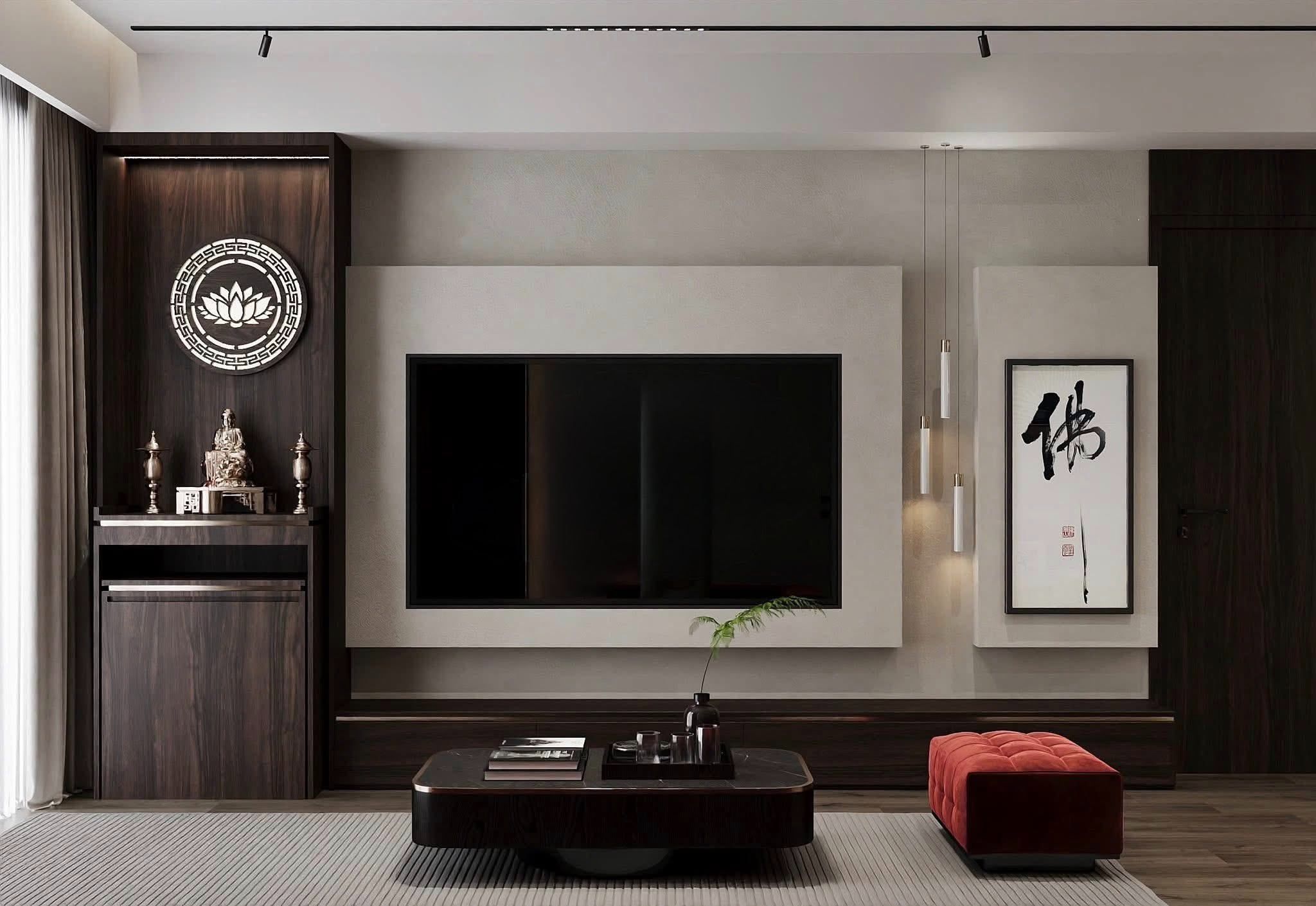 - Hệ kệ tivi kết hợp tủ thờ thiết kế âm tường xử lý vật liệu gỗ sẫm màu giúp không gian trang nghiêm nhưng không nặng nề