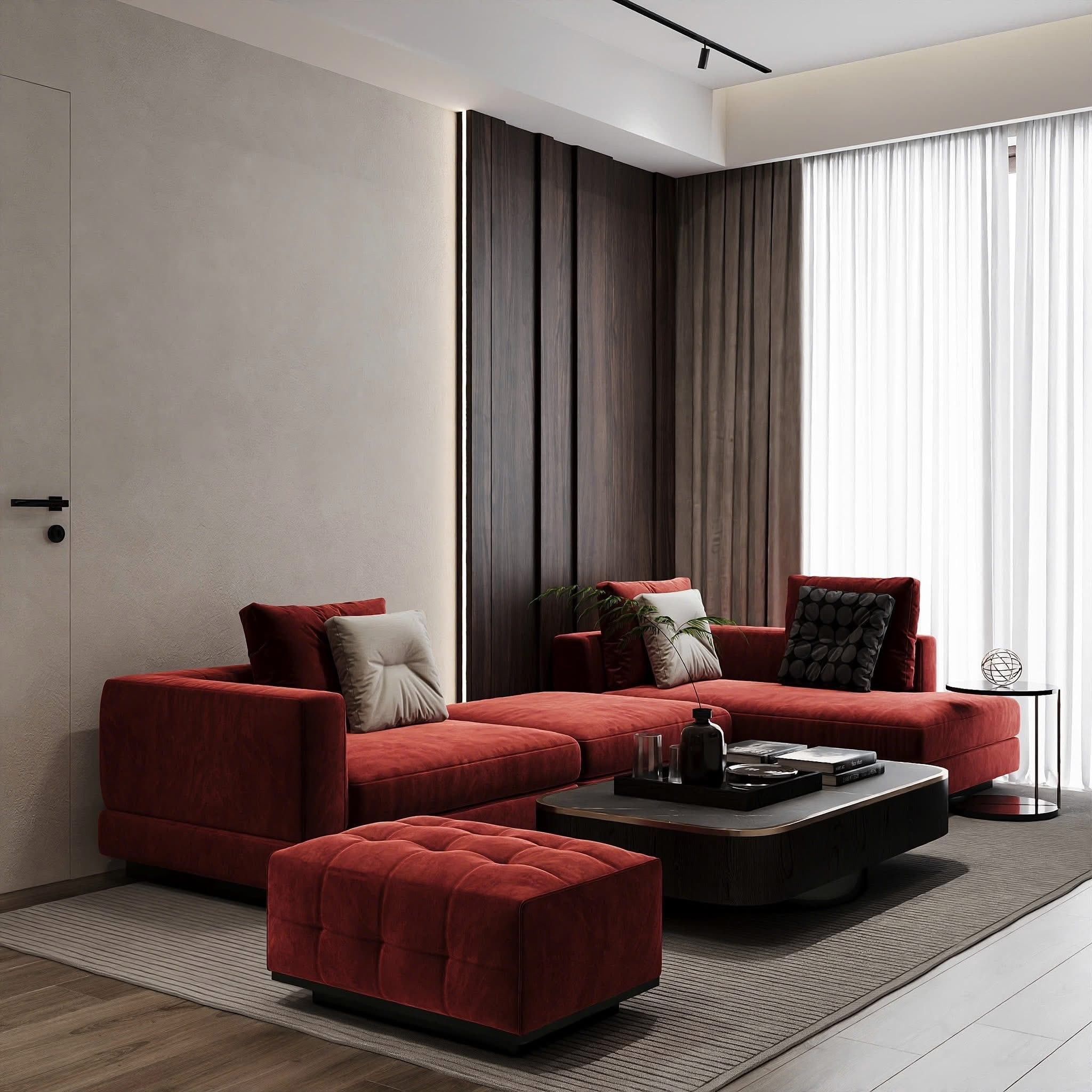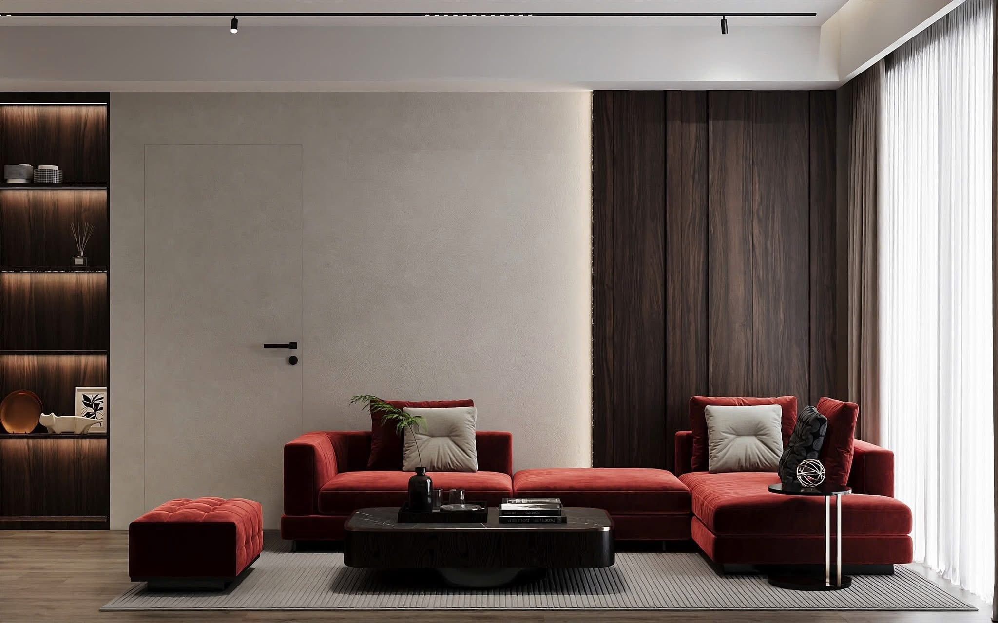- Sofa dáng thấp bọc nỉ đỏ trầm tạo điểm nhấn thị giác nổi bật