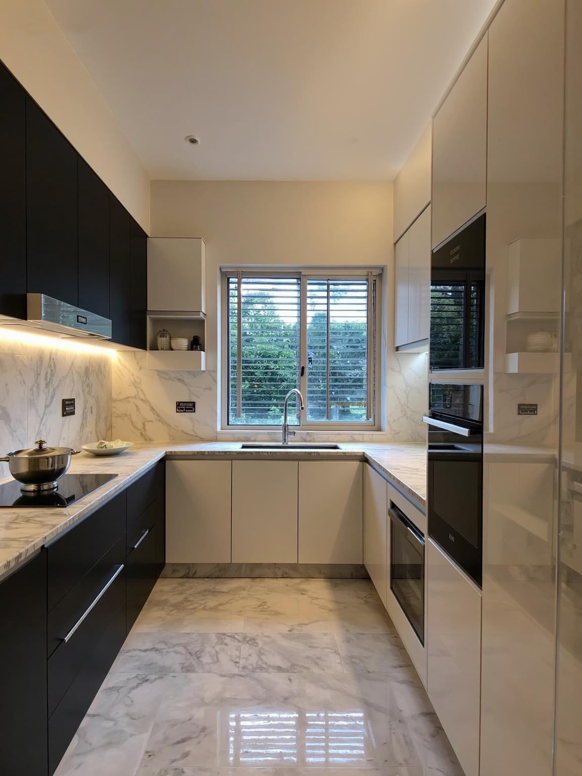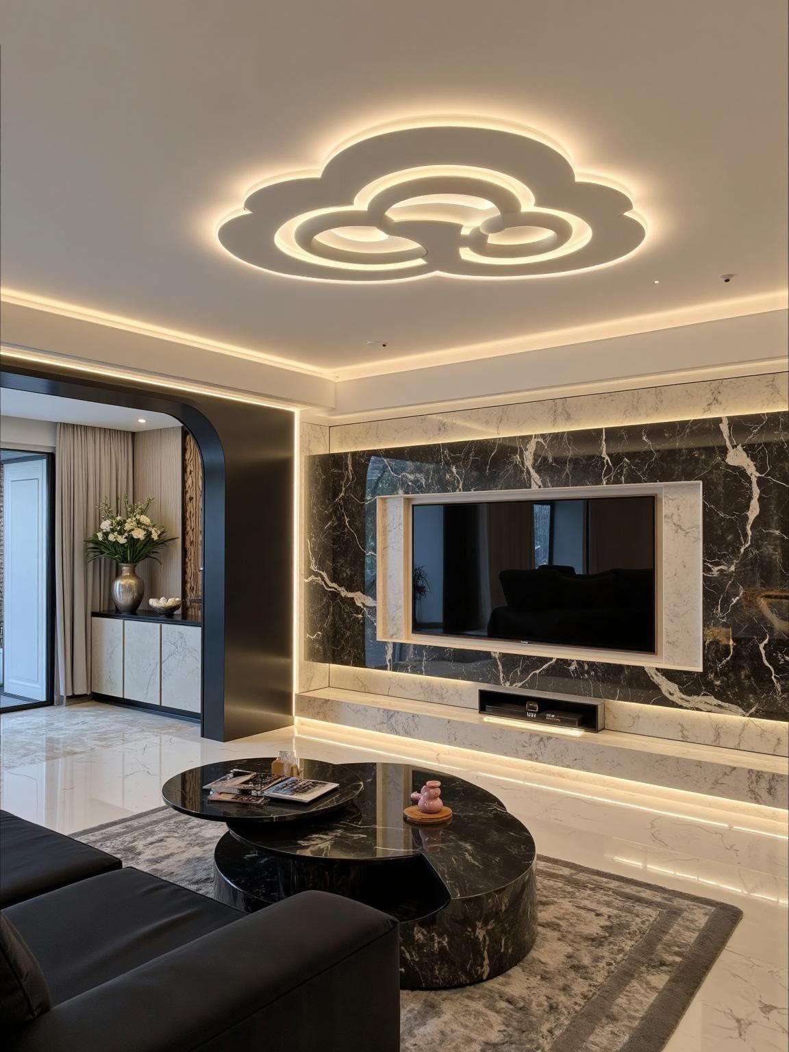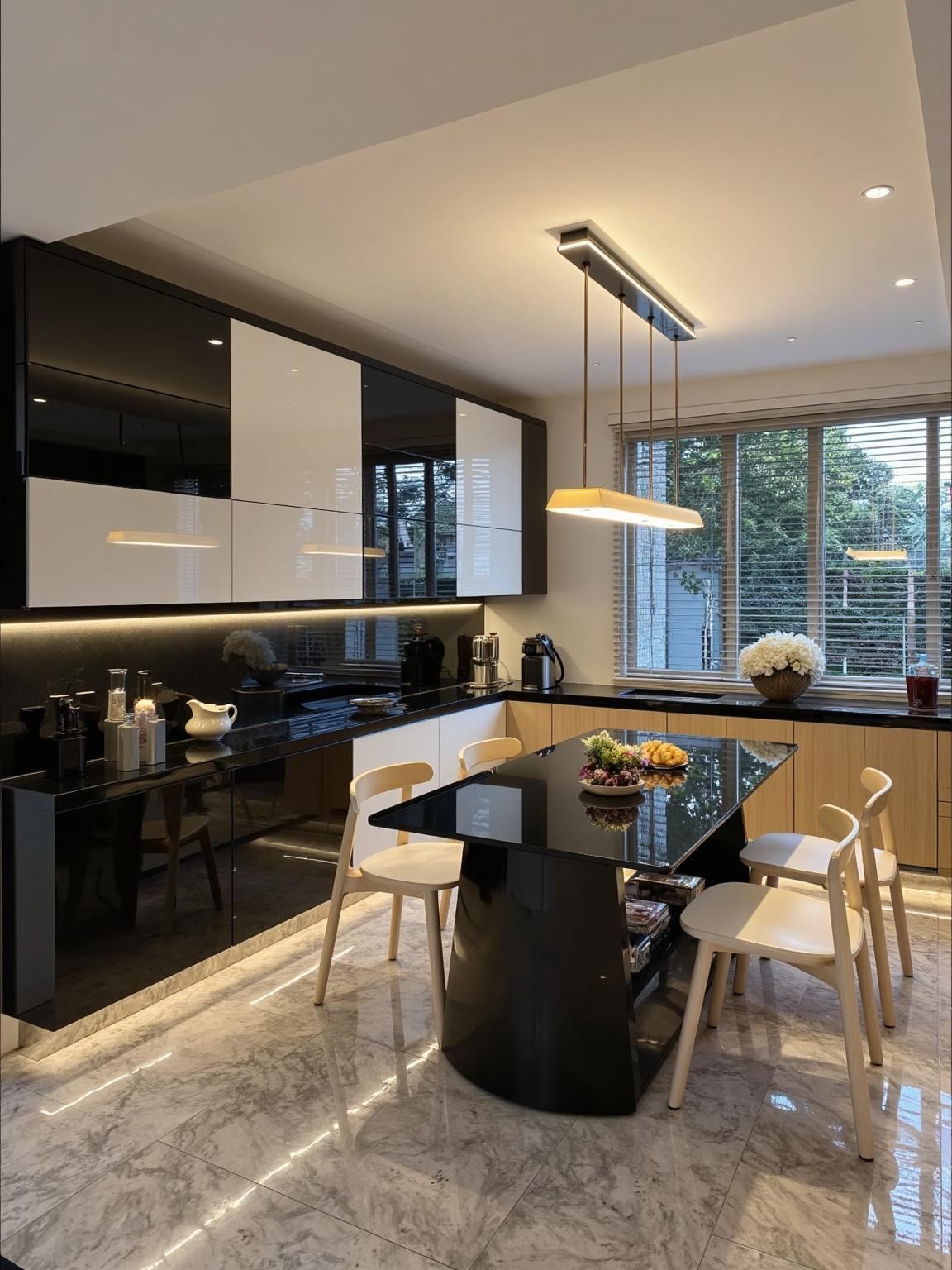 Khám phá mẫu thiết kế nội thất hiện đại tông đen – trắng với vật liệu đá marble, ánh sáng LED tinh tế và không gian sống chuẩn phong cách châu Âu.