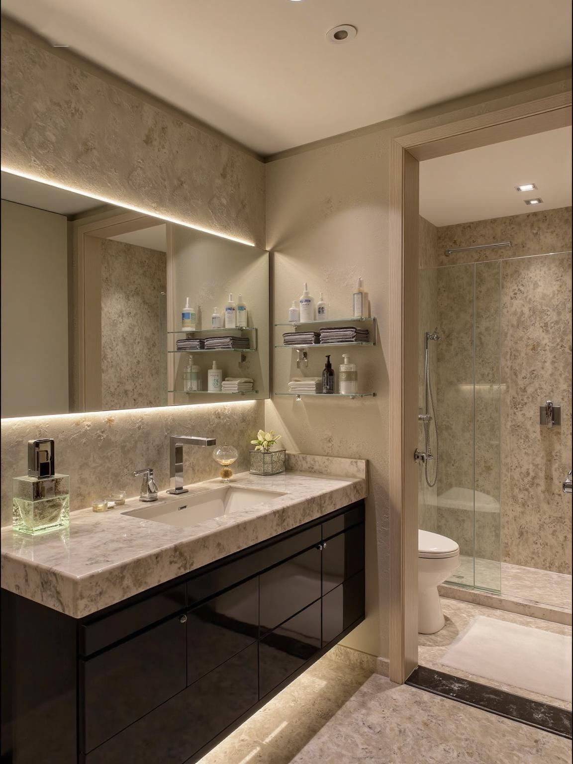 Phòng tắm sử dụng đá granite xám vàng nhạt làm vật liệu chủ đạo, kết hợp gương lớn và đèn LED hắt sáng giúp không gian rộng hơn.