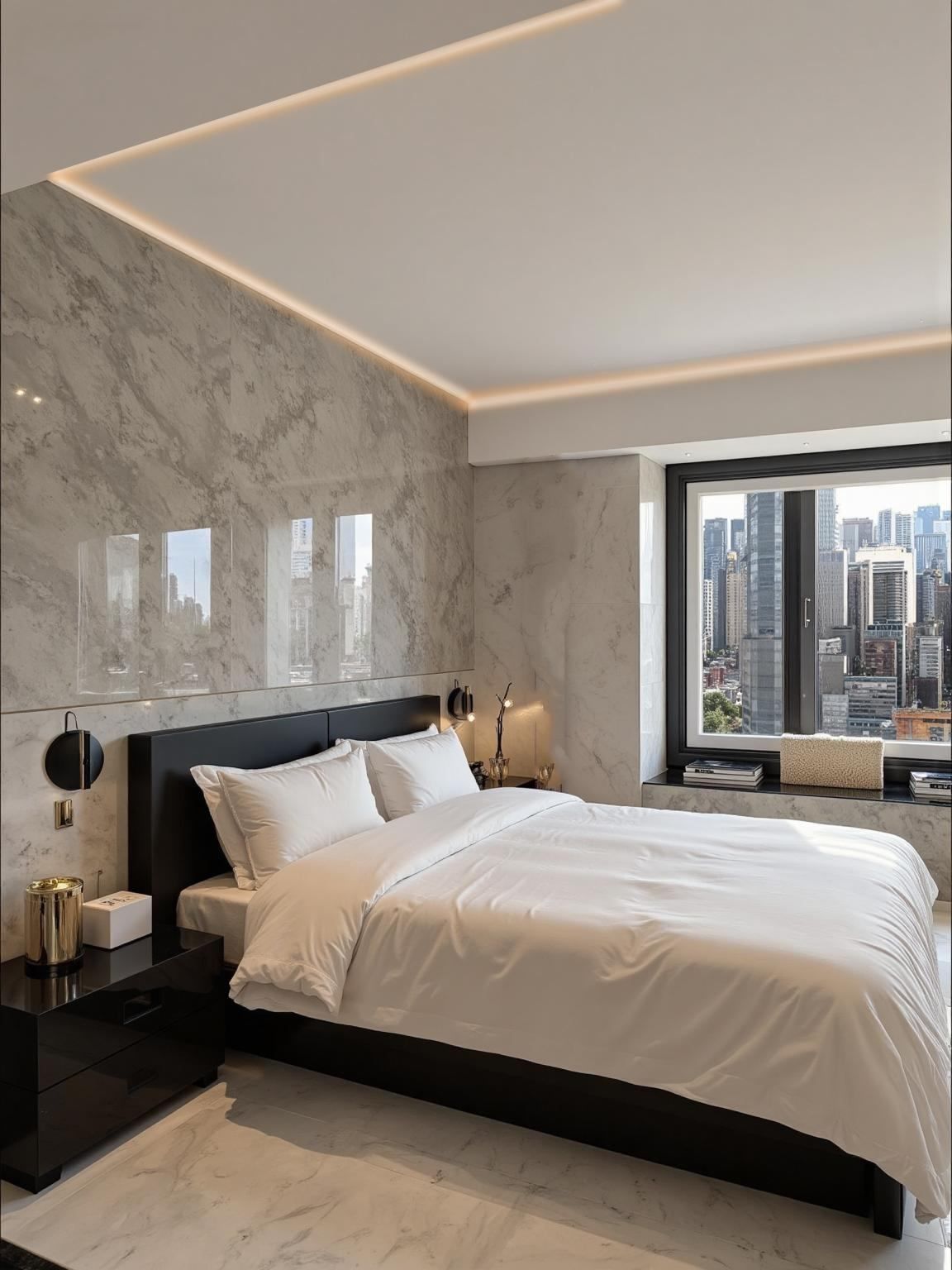 Phòng ngủ sử dụng tường và sàn ốp đá marble sáng, kết hợp giường, tủ, tab đầu giường màu đen bóng để tạo độ tương phản.
