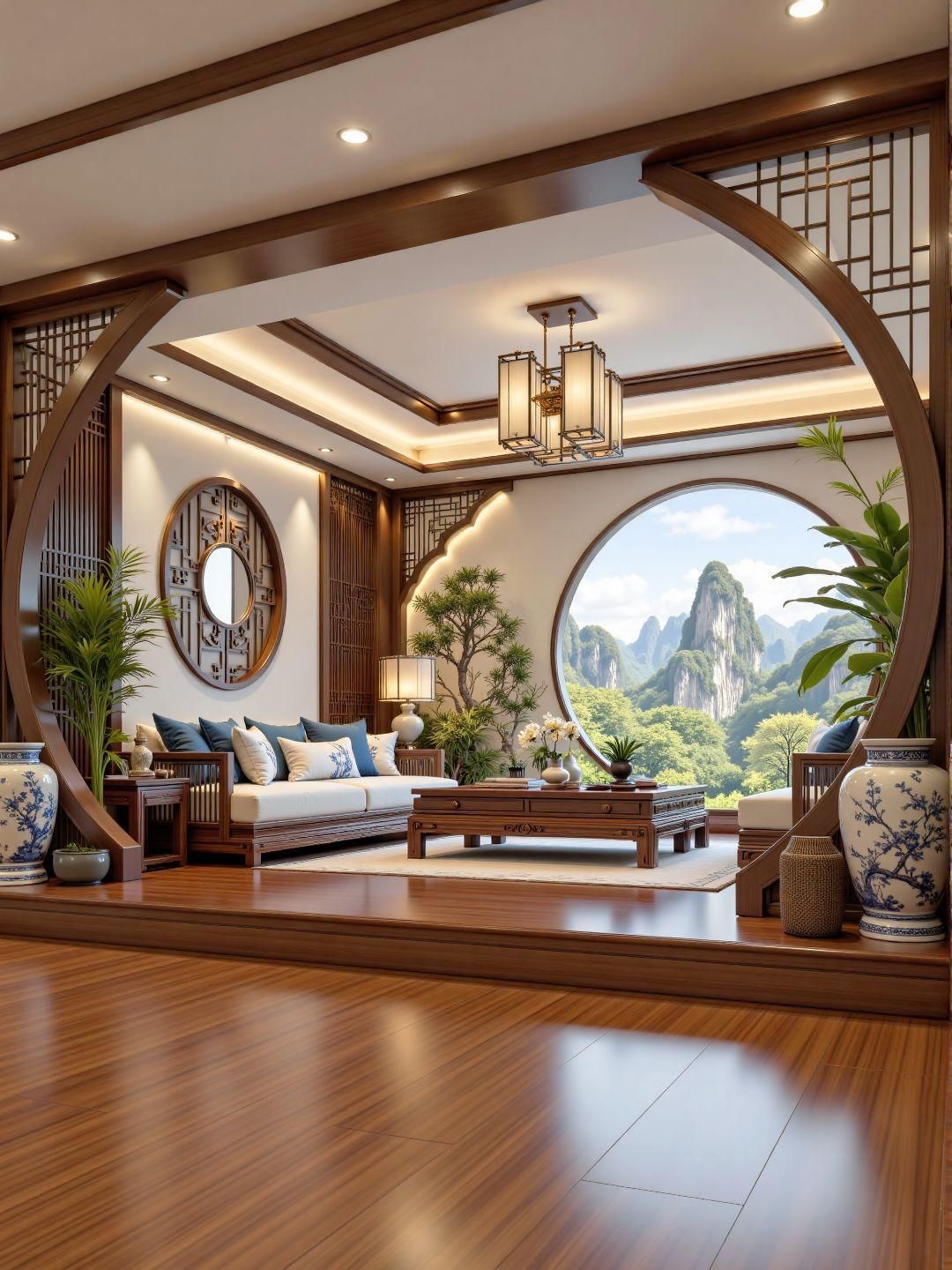 Phòng khách gây ấn tượng mạnh bởi bố cục cân đối, đường nét sắc sảo và sự kết hợp giữa gỗ tự nhiên cùng hoa văn mang âm hưởng Đông Dương.