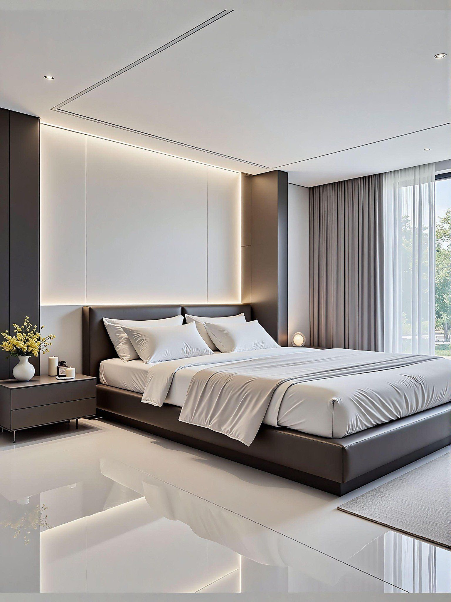 Ánh Sáng Gián Tiếp: Đèn LED hắt sau vách đầu giường tạo không gian nghỉ ngơi yên tĩnh, tránh ánh sáng trực tiếp.