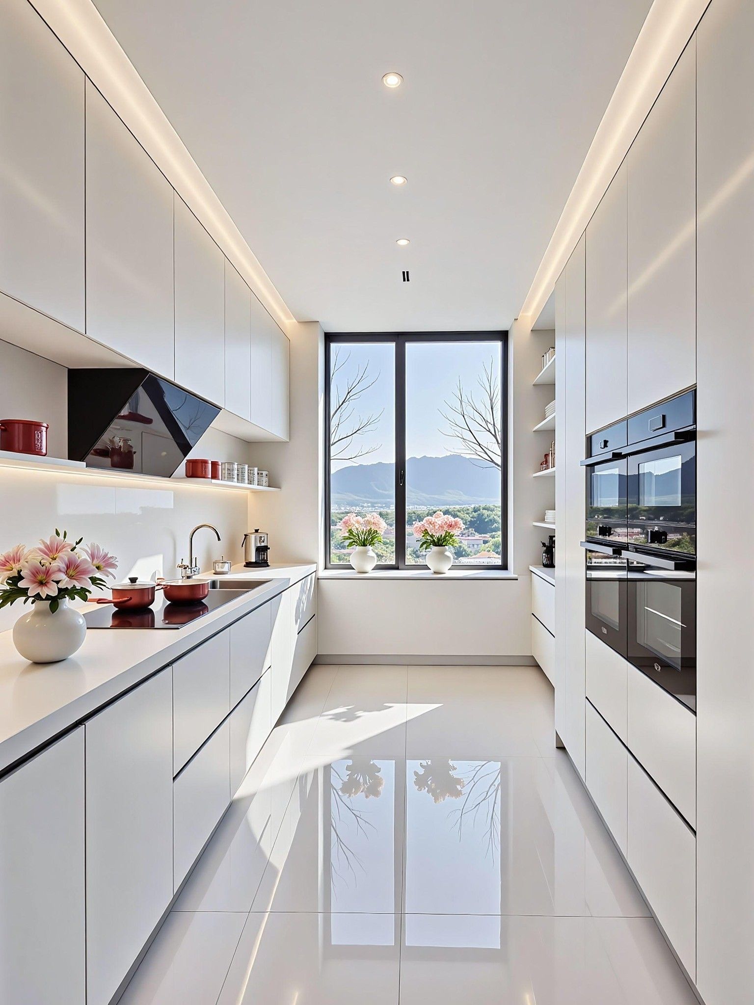 Khu vực bếp được bố trí dạng song song (galley kitchen) giúp tối ưu diện tích, thuận tiện cho di chuyển và nấu nướng.