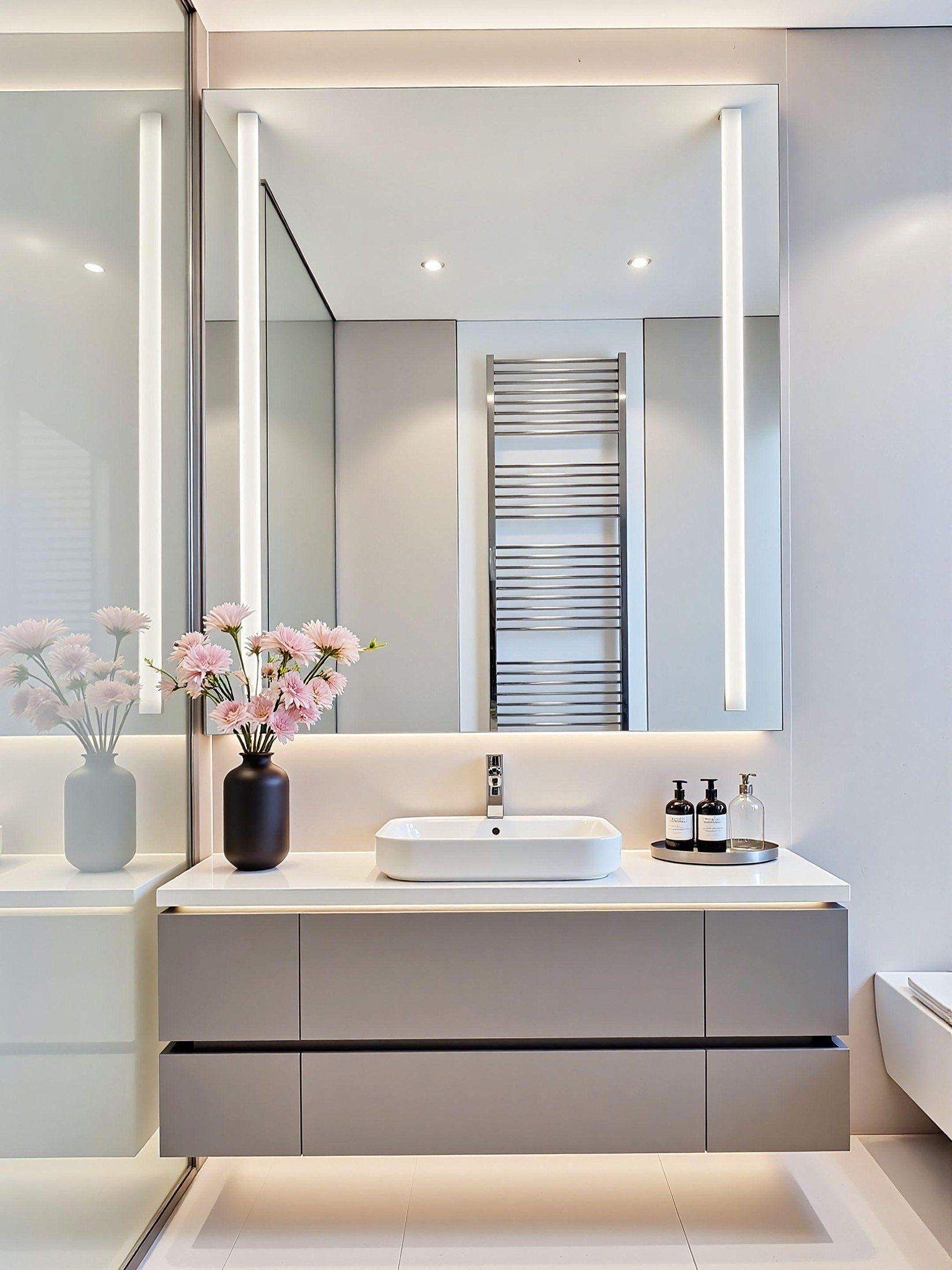 Phòng tắm sử dụng tông màu trắng, xám kết hợp ánh sáng LED ẩn sau gương, mang lại cảm giác thư giãn, sạch sẽ và tinh khiết.