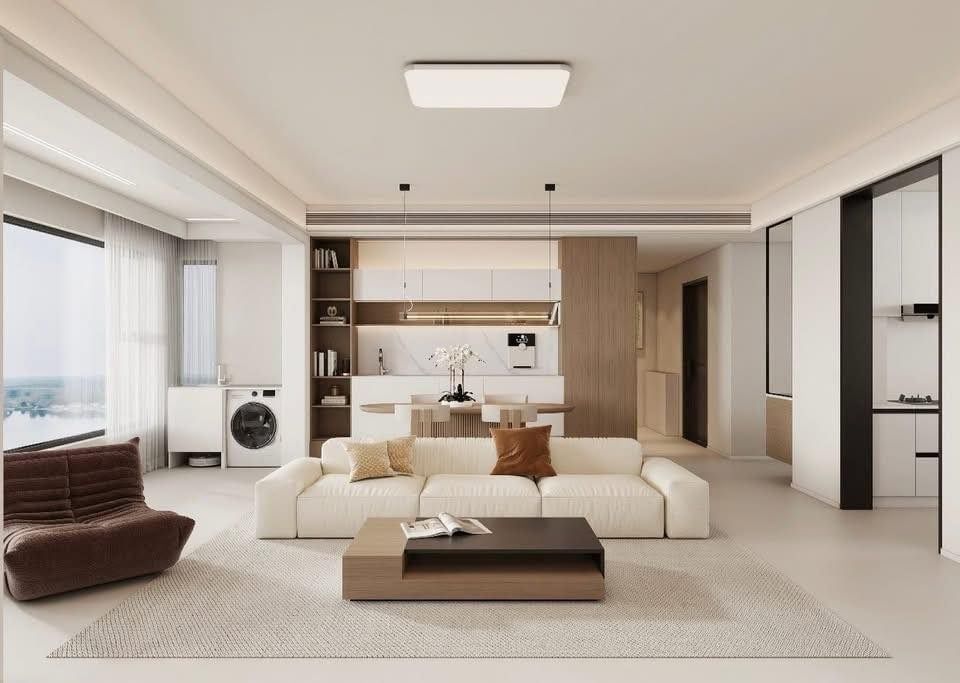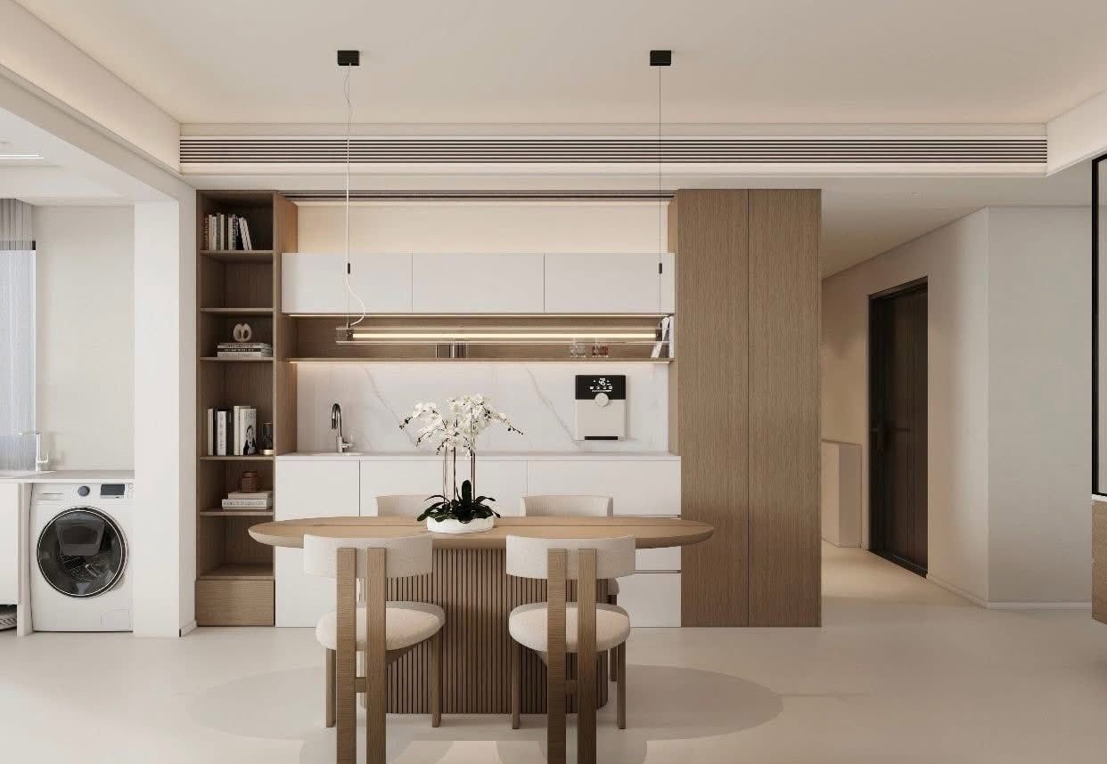 Căn hộ sử dụng bảng màu trung tính gồm trắng, be và gỗ sáng làm chủ đạo. Hệ nội thất được thiết kế phẳng, liền mạch, hạn chế chi tiết rườm rà nhưng vẫn đảm bảo sự ấm áp và tinh tế.
