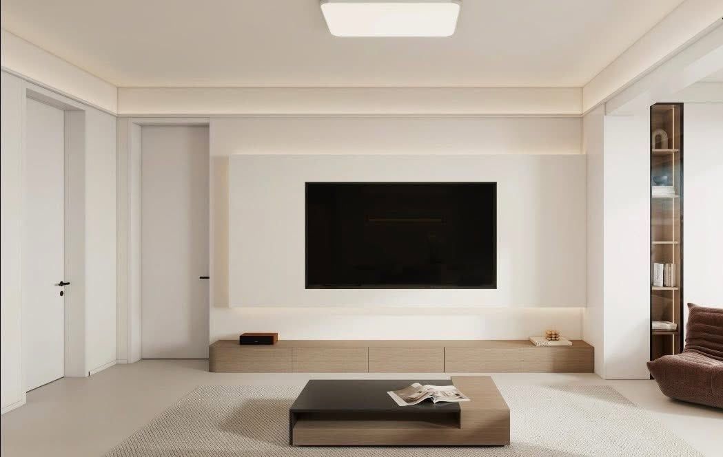 Kệ TV treo tường kết hợp tủ thấp chạy dài, vừa tăng công năng lưu trữ vừa đảm bảo thẩm mỹ