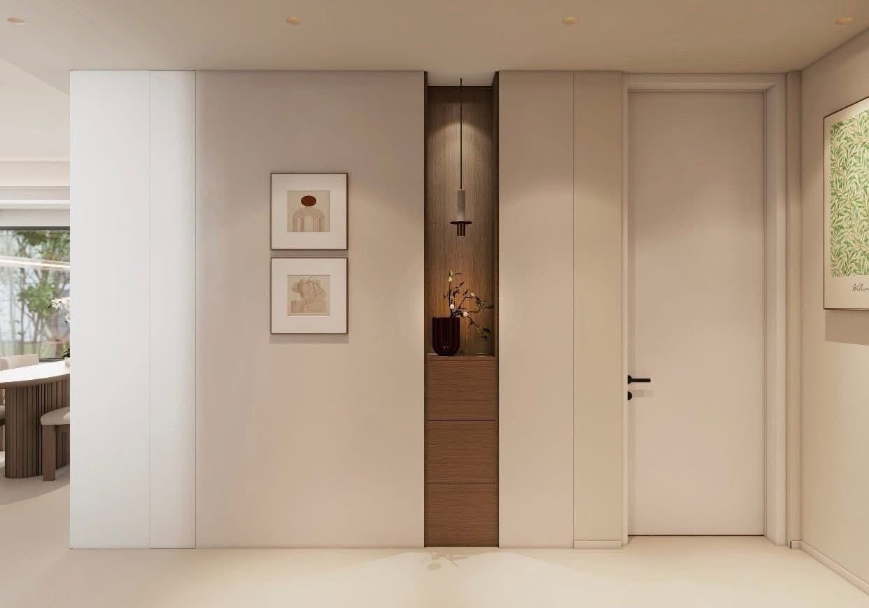 Hành lang được xử lý khéo léo với hệ tủ âm tường và hốc trang trí: