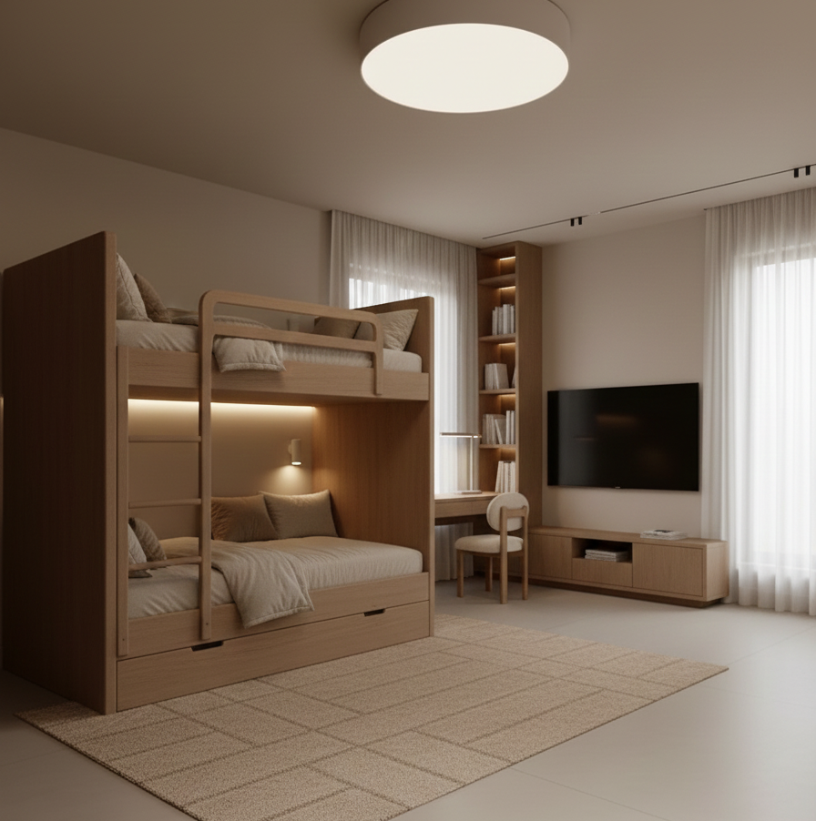 Phòng ngủ trẻ em được thiết kế khoa học với giường tầng gỗ tự nhiên, tạo không gian rộng rãi và an toàn cho các bé.